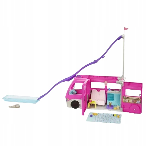 ⭐rozłóż Kamper Marzeń, a przed Tobą rozwiją się kuchnia, łazienka, basen, zjeżdżalnia i miejsce wypoczynkowe z telewizorem! Stwórz swoją własną jadalnię i sypialnię na świeżym powietrzu, tworząc wyjątkowe scenariusze dla lalki Barbie® i jej przyjaciół!
