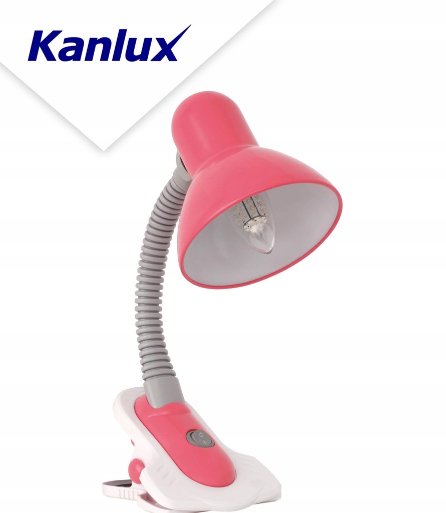 Lampka biurkowa Suzi w kolorze różowym firmy Kanlux to utrzymana w młodzieżowym stylu lampa, która może być mocowana do biurka lub półki za pomocą klipsa.