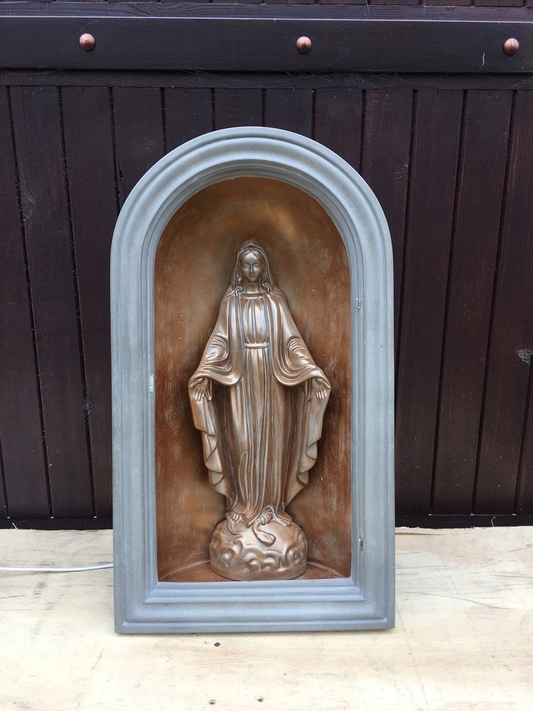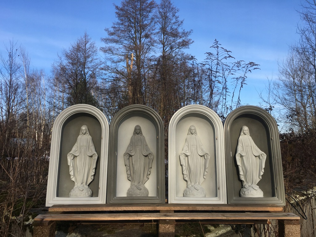 Ręcznie wyprodukowana kapliczka z figurą Matki Boskiej Niepokalanej przystosowana do montażu na elewacjach zewnętrznych i wewnętrznych. Wykonana z wysokiej jakości mieszanki betonu architektonicznego. Dzięki autorskiej technice opracowanej w naszej manufakturze osiągamy efekt niezwykle gładkiej powierzchni (jak polerowany granit lub marmur) przy jednoczesnym precyzyjnym odwzorowaniu wszelkich szczegółów zarówno postaci jak i elementów dekoracyjnych.