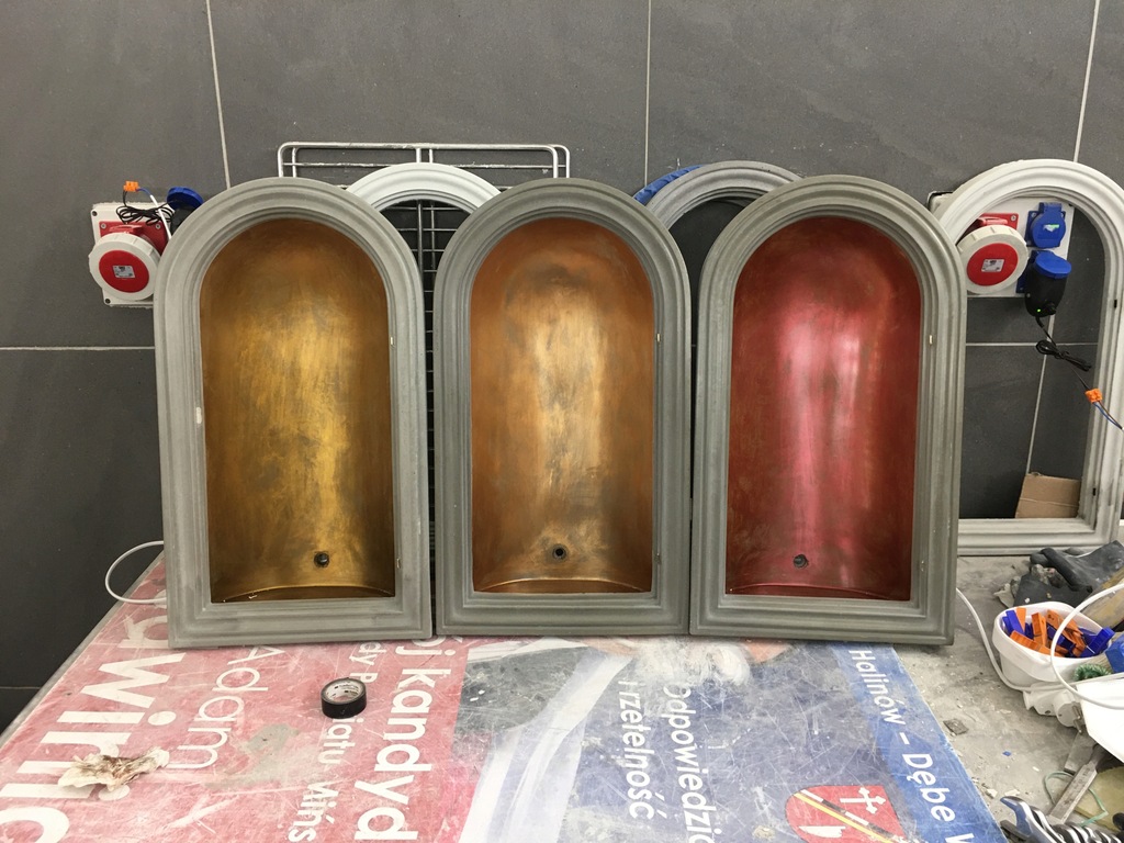 nisza: biały, bądź szary beton, możliwe nałożenie patyny w kolorze złoto (mosiądz), brąz (spiż), bądź miedziany