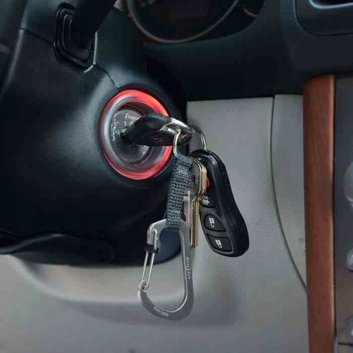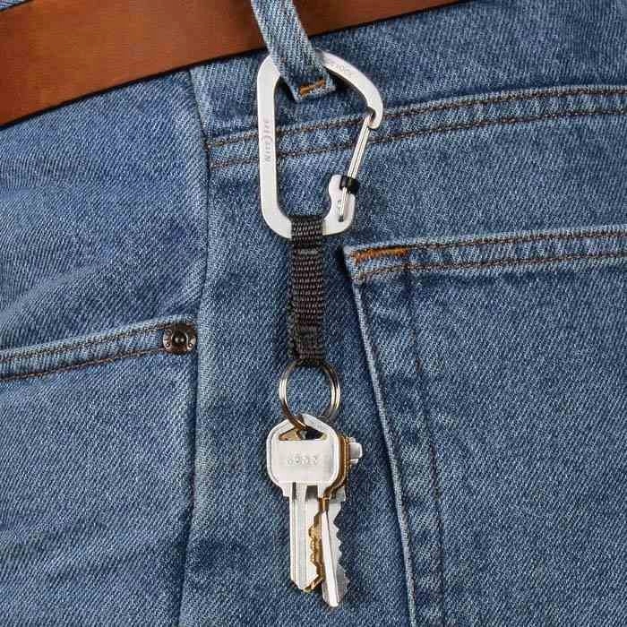Dołączona do karabinka nylonowa taśma zakończona jest stalowym kółkiem na klucze.