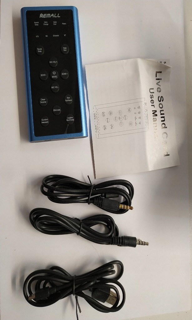 W zestawie: urządzenie, kabel usb, kabel jack, kabel micro usb na jack, instrukcja angielska.