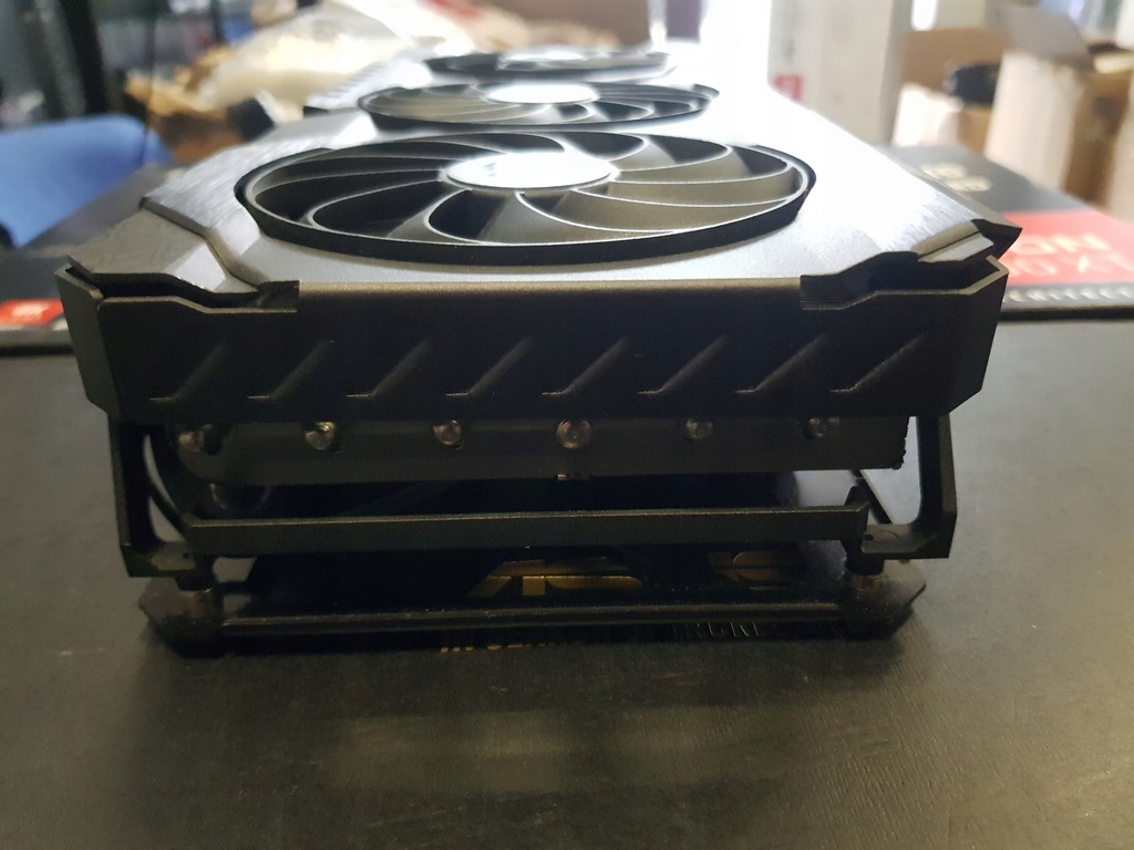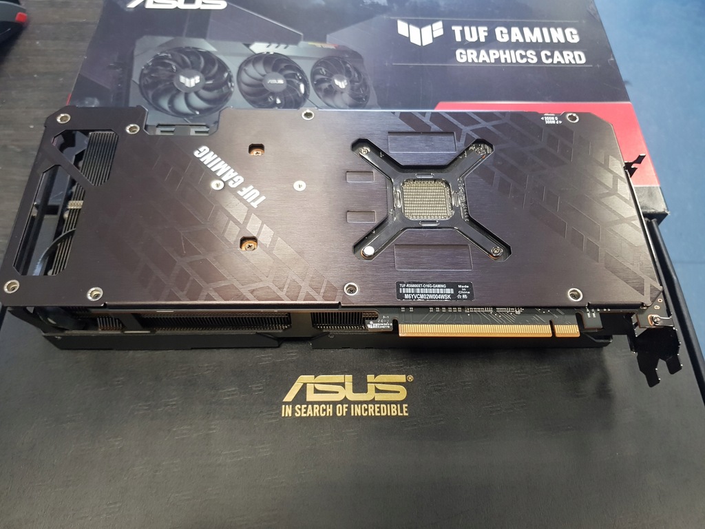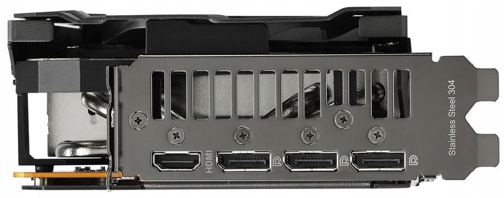 Spód karty kryje dalsze ulepszenia. Większość tylnej części jest osłonięta ochronną metalową płytą tylną, która jest wyposażona w szeroki otwór wentylacyjny. Otwór wentylacyjny umożliwia ucieczkę gorącego powietrza w stronę wentylatorów odprowadzających umieszczonych w obudowie zamiast zawracania w stronę chłodnicy procesora graficznego. Wspornik procesora graficznego zapewnia dodatkową stabilność krytycznego połączenia między matrycą a rozpraszaczem ciepła. Wspornik wejścia/wyjścia jest wykonany ze stali nierdzewnej, aby chronić porty i zapewnić bezpieczniejszy montaż. Dogodnie umieszczony przełącznik Dual Bios umożliwia dostosowanie domyślnego profilu wydajności karty bez oprogramowania.