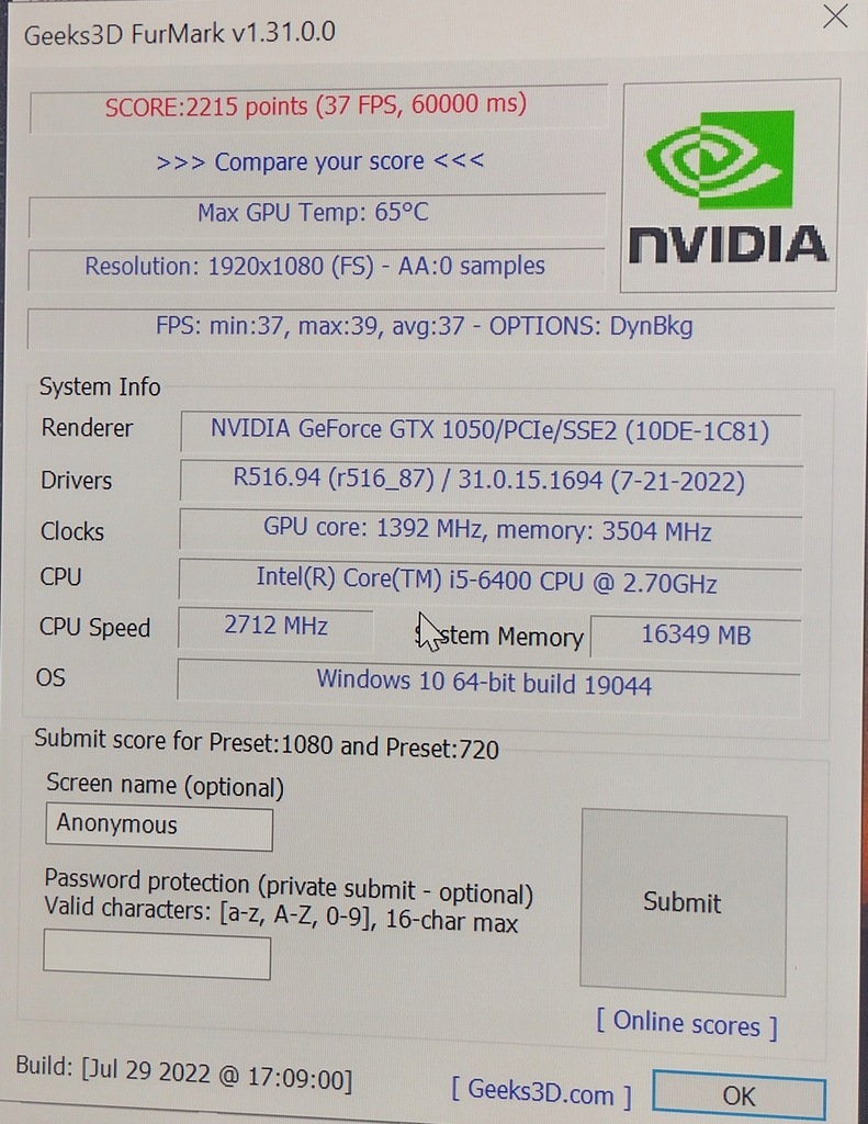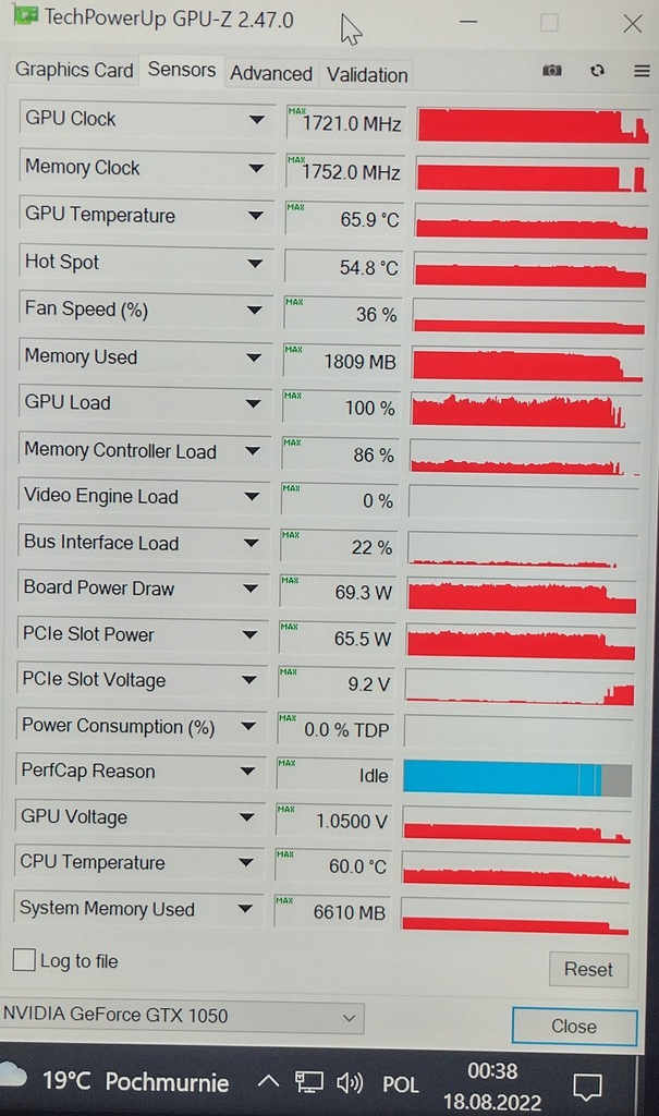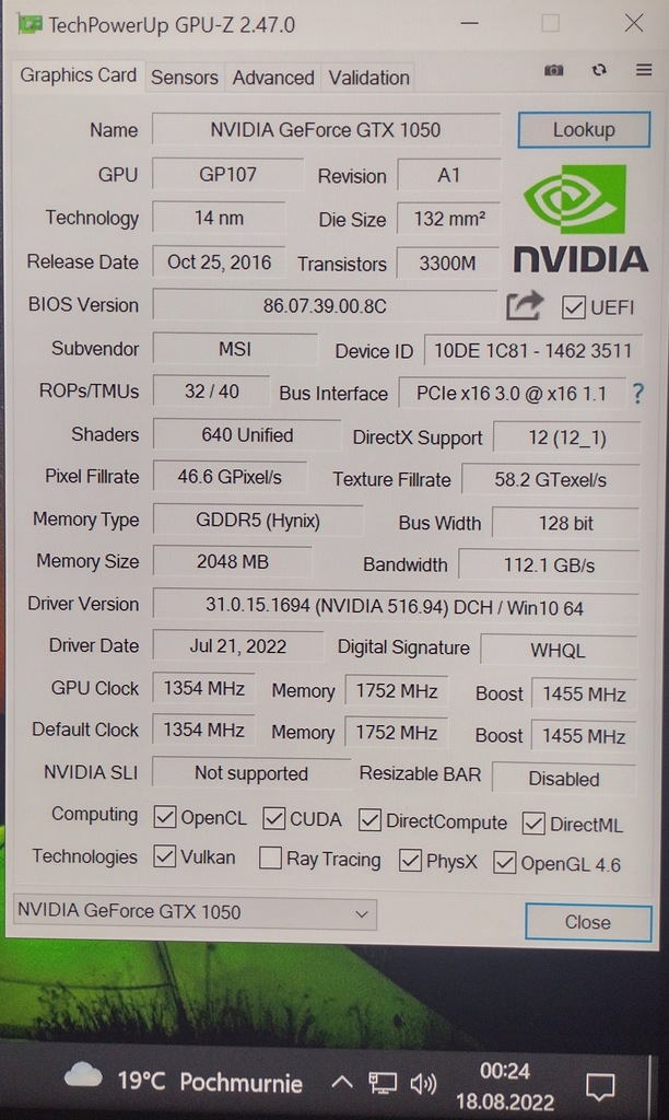 Karta graficzna MSI GeForce GTX 1050 2GB GDDR5 V351 ver. 2.0. Działa perfekcyjnie. Grałem w WatchDogs2 FullHD 1920x1080p, 60 FPS (Hz), ustawienia niskie. U mnie podczas gry temperatura nie przekracza 64 stopni. Stan bardzo dobry. Całkowicie sprawna. Minimalne wymagania systemowe: procesor 4 wątkowy, 8GB RAM, system Windows 7 - 10 64 bity, zasilacz 350W. Zalecane wymagania systemowe: procesor 4 rdzeniowy, 16GB RAM, system Windows 10 64 bity, zasilacz 400W. Polecam