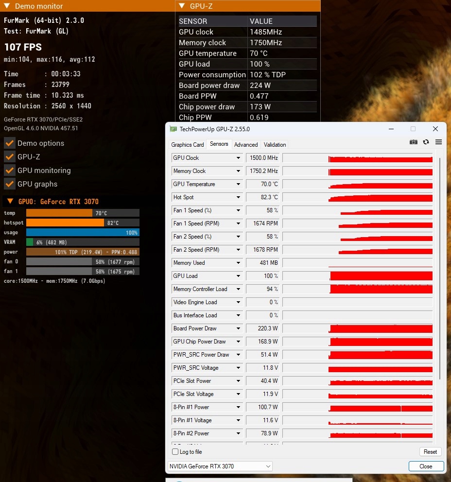Przetestowana pod obciążeniem programami FurMark oraz 3DMark, oba testy przeszła bez zastrzeżeń, nie występują żadne problemy ze stabilną pracą karty czy przegrzewaniem się przy mocnym obciążeniu w rozdzielczości 2K (test widoczny na ostatnim zdjęciu).