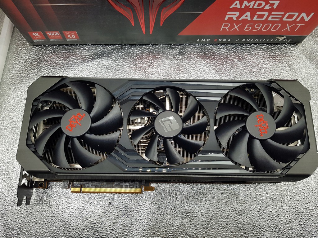 Karta Graficzna, AMD Radeon RX 6900 XT Ultimate Overclocked (Core clock 2015 MHz / Boost clock 2425 MHz), 5120 Stream rdzenie, 16 GB GDDR6 (Memory clock 16 GHz) - 256-bit, PCI-Express 4.0 x16, 3 x DisplayPort 1.4 / HDMI 2.1 połączenia, podpory AMD FreeSync, 3 x 8-pins złącze zasilania, długość karty: 320mm - Powercolor Triple Fan low noise cooler & Devil Zone RGB