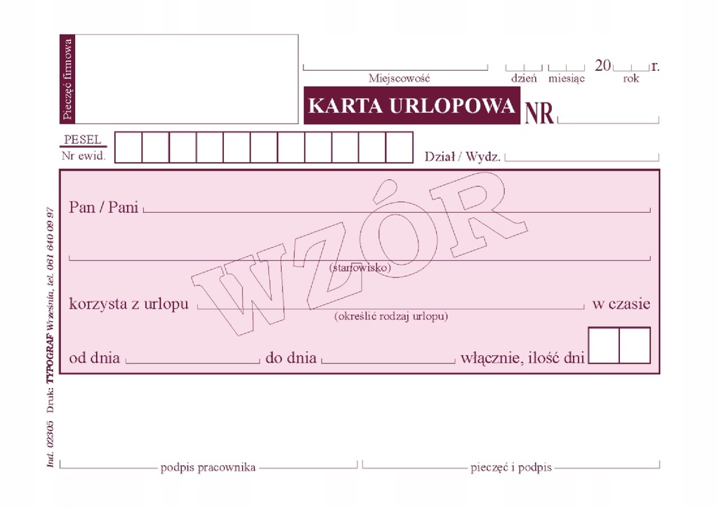 Karta Urlopowa Druk dla Pracowników Biurowy A6