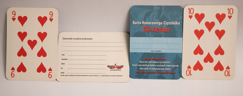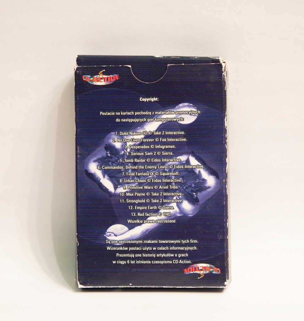 Przedmiotem sprzedaży jest talia kart, wydana przez czasopismo CD-Action z okazji szóstych urodzin, czyli mają 21 lat. Figury od waletów po jokery przedstawiają postacie z gier, między innymi Duke Nukem'a, Larę Croft, czy Maxa Payne'a. Pudełko jest trochę sfatygowane, ale karty nie były używane i talia jest kompletna.