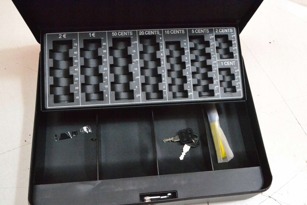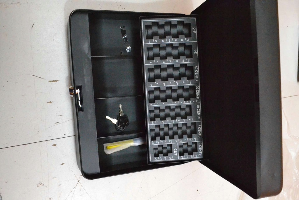Wykonany z blachy stalowej z odporną na uderzenia powłoką proszkową – zamek bębenkowy z 2 kluczami – wyjmowana wkładka do monet – długopis do testowania banknotów – kolory: czarny matowy – waga kasetki na pieniądze: 1160 g – waga kołka kontrolnego: 10 g – wymiary kasetki na pieniądze: 300 x 240 x 90 mm – mm – mm – mm – mm