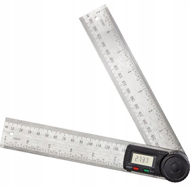 Kątomierz posiada wyświetlacz LCD, zerowanie w dowolnej pozycji, linijka ze skalą mm/cal, długość otwartego ramienia 400 mm.