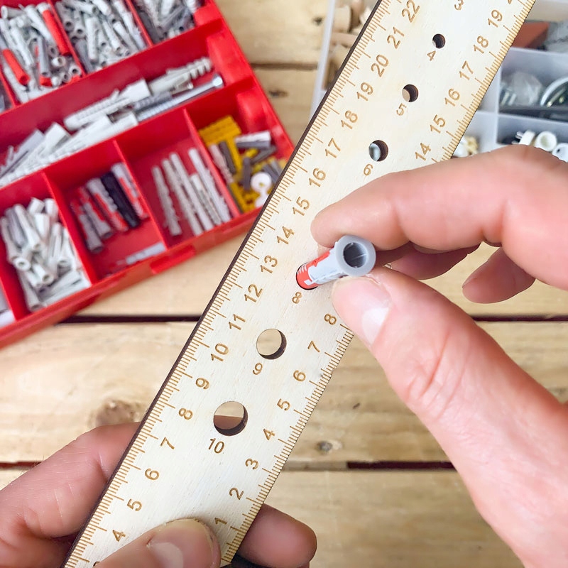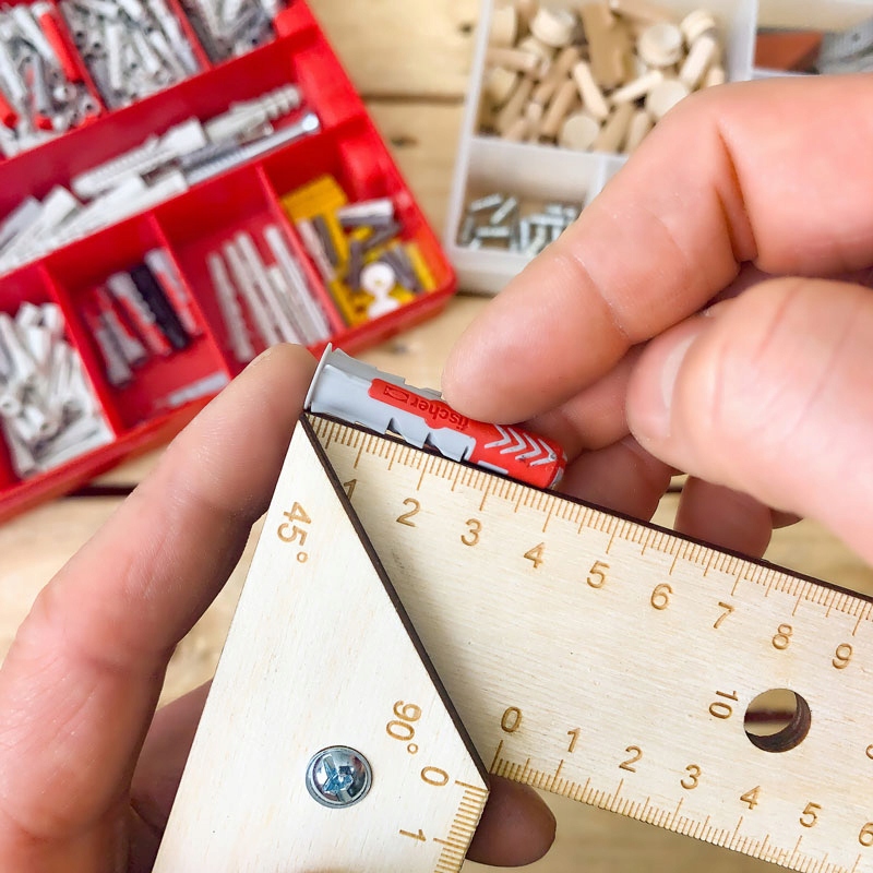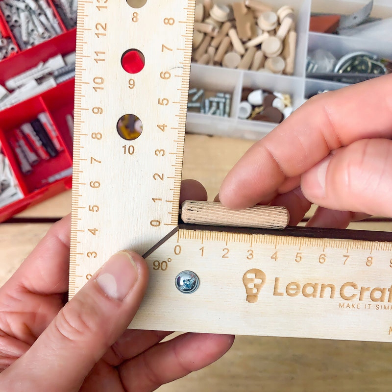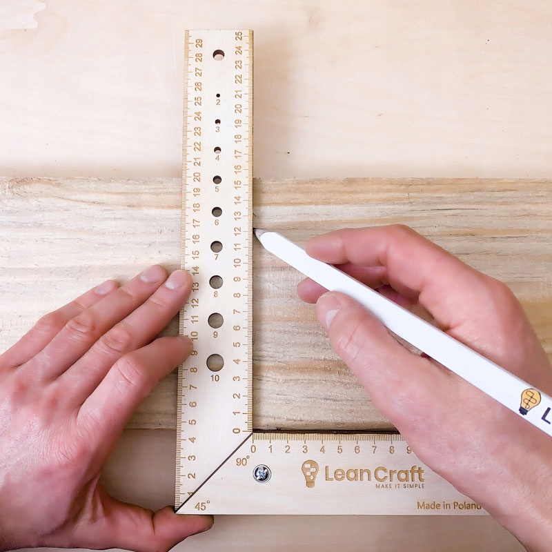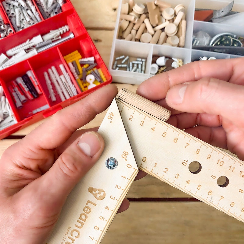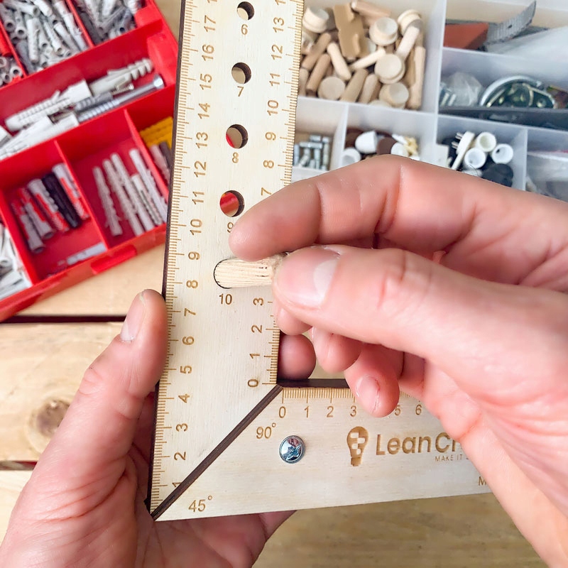 Kątownik KONKO-3 wykonany jest z 6 mm sklejki – docenią to osoby preferujące narzędzia wykonane z materiałów naturalnych. Podziałka metryczna umieszona na ramieniu pozwala na pomiar od jej krawędzi jak i od stopki, a sprawdzian narzędziowy znajdujący się na nim pomaga sprawnie określić wielkość śrub, wkrętów i kołków. Podstawa kątownika z naniesioną podziałką pomaga w wygodnym i precyzyjnym przyłożeniu do przedmiotu.