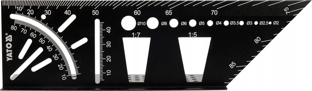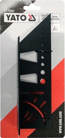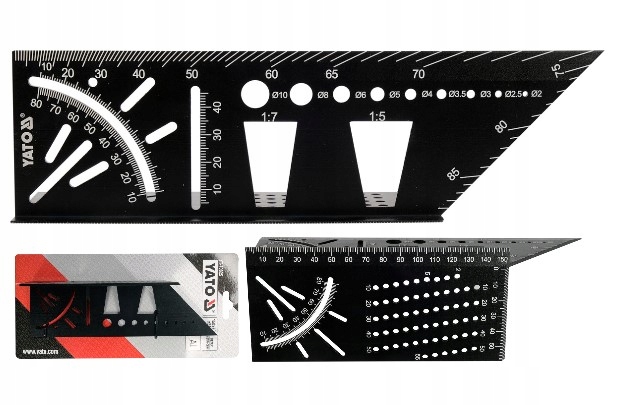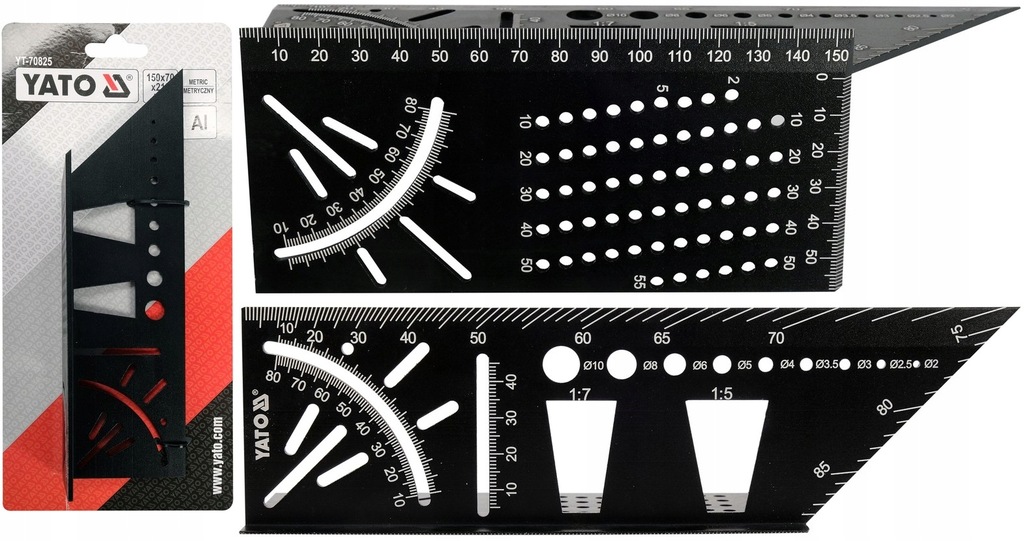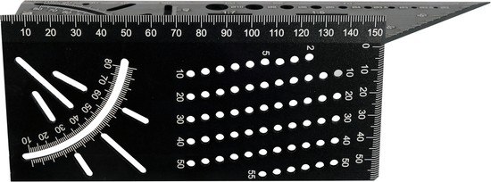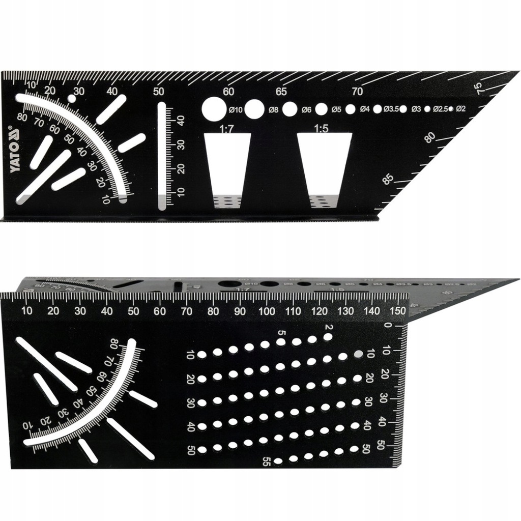 Kątownik przestrzenny przeznaczony do prac stolarskich . Wykonany z aluminium .Na krawędziach posiada naniesione podziałki milimetrowe . Wymiary 150 x 70 x 215 mm, grubość 2,8 mm . Kątownik zawiera używane w stolarstwie szablony np. jaskółczy ogon , szablony otworów , kątomierz i inne. Wykończenie powierzchni - anodowane w kolorze czarnym Kątownik przeznaczony do prac stolarskich .