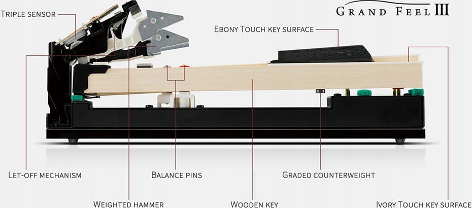 Klawiatura Grand Feel III posiada nie tylko ważony mechanizm symulujący pracę młotków. Dodatkowo, każdy klawisz został wyposażony w przeciwwagę, czyli metalowy ciężarek przymocowany do spodniej części klawisza w precyzyjnie wyznaczonym miejscu. Pomaga to zrównoważyć pracę klawiatury podczas gry pianissimo, a także zapewnia lepsze odczucia podczas gry z dużą siłą. Klawisze z przeciwwagą stosowane są jedynie w najwyższych modelach pianin cyfrowych. Poszczególne klawisze są wyważane w odmienny sposób, co wpływa na różną ich „twardość” w różnych partiach klawiatury – zupełnie jak w prawdziwym akustycznym instrumencie, w którym grubość strun wpływa na zachowanie się klawiszy.