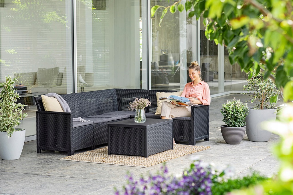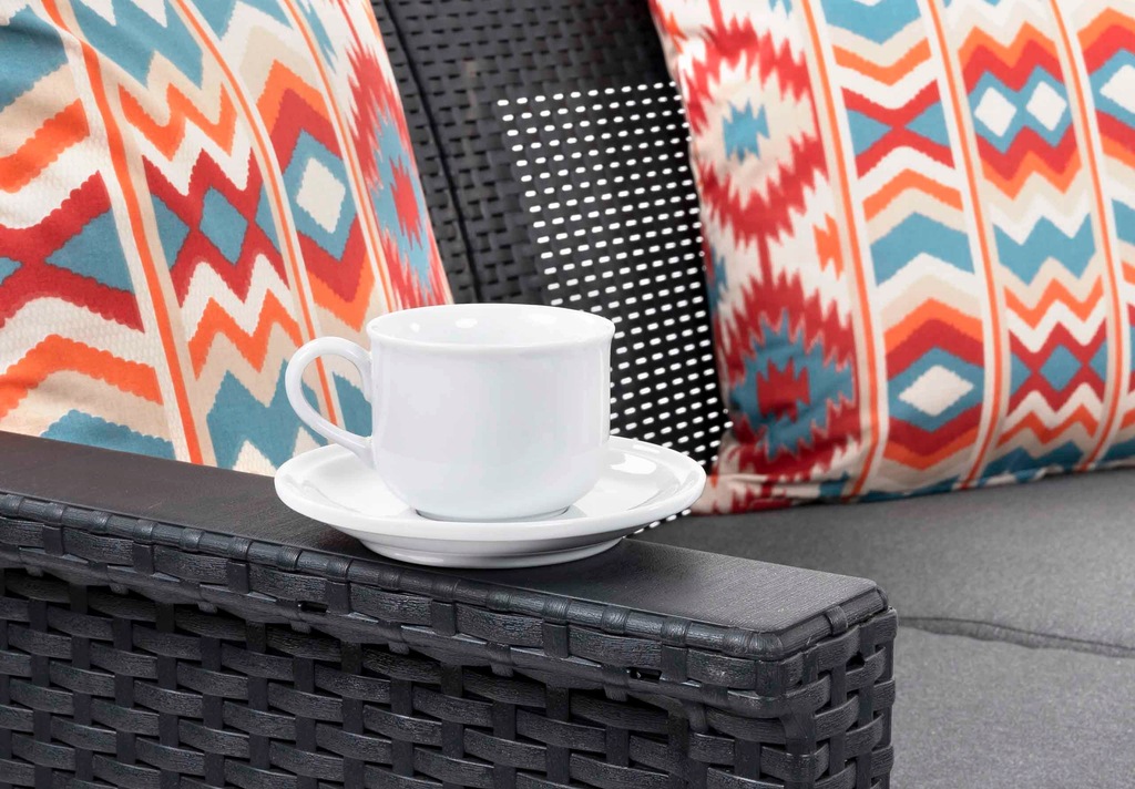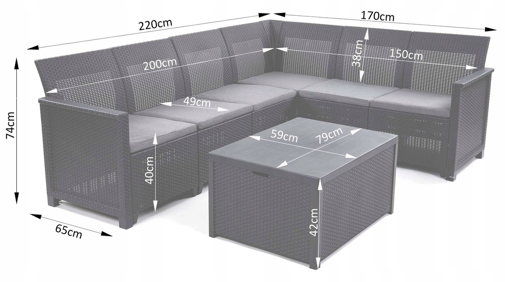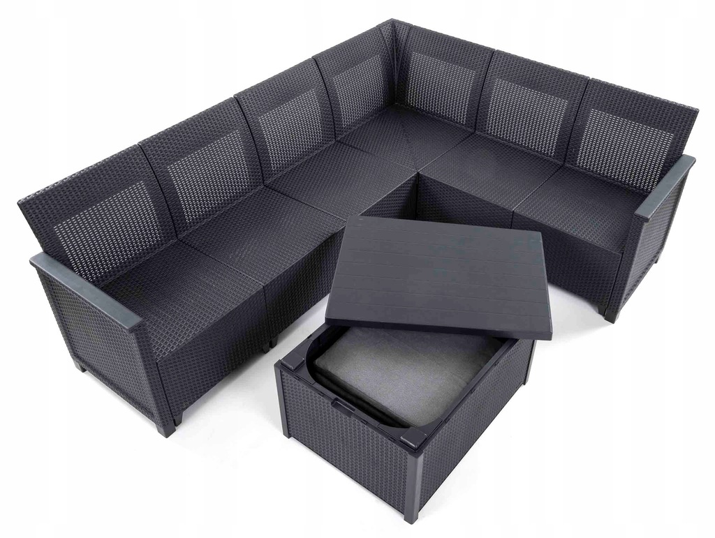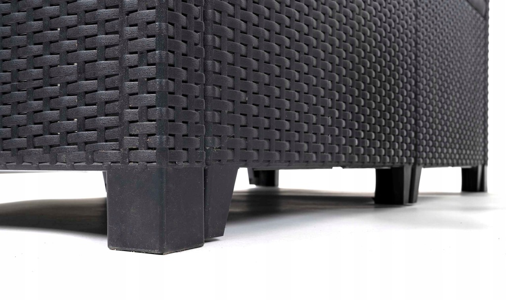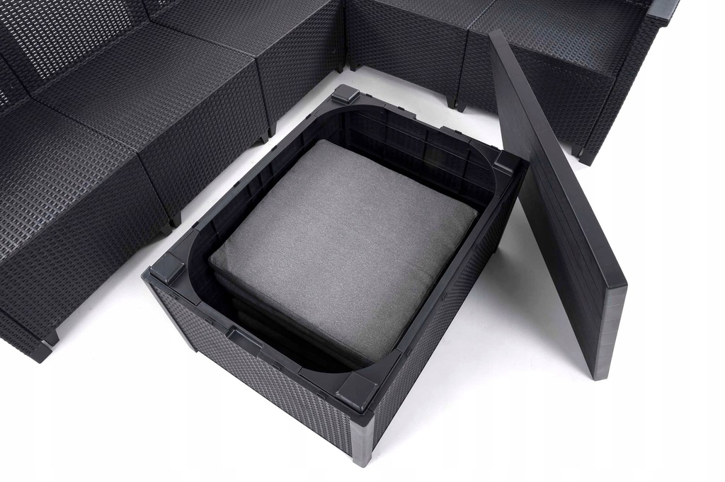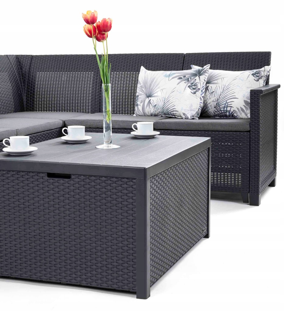 W zestawie znajduje się funkcjonalny stolik z opcją schowka. Można w nim przechować koce ogrodowe, poduszki i inne akcesoria na które z reguły trudno znaleźć miejsce. Wewnątrz zmieszczą się wszystkie poduszki siedziskowe z zestawu.