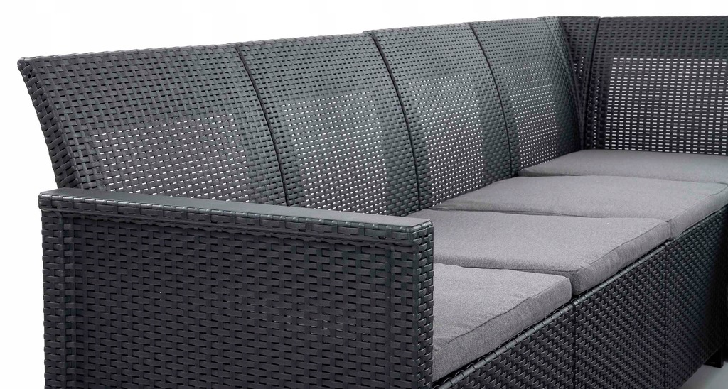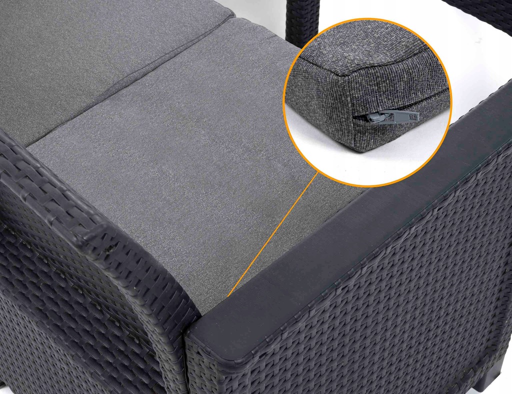 Tworzywo z jakiego zostały wykonane meble jest w 100% odporne na wilgoć i promieniowanie UV. Nie ma obaw, że zestaw zmieni kolor lub wyblaknie. Meble mogą stać na zewnątrz przez cały rok. Należy zabezpieczyć jedynie poduszki.