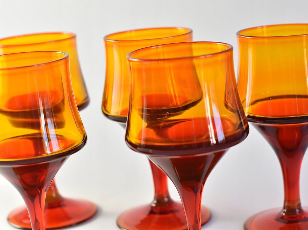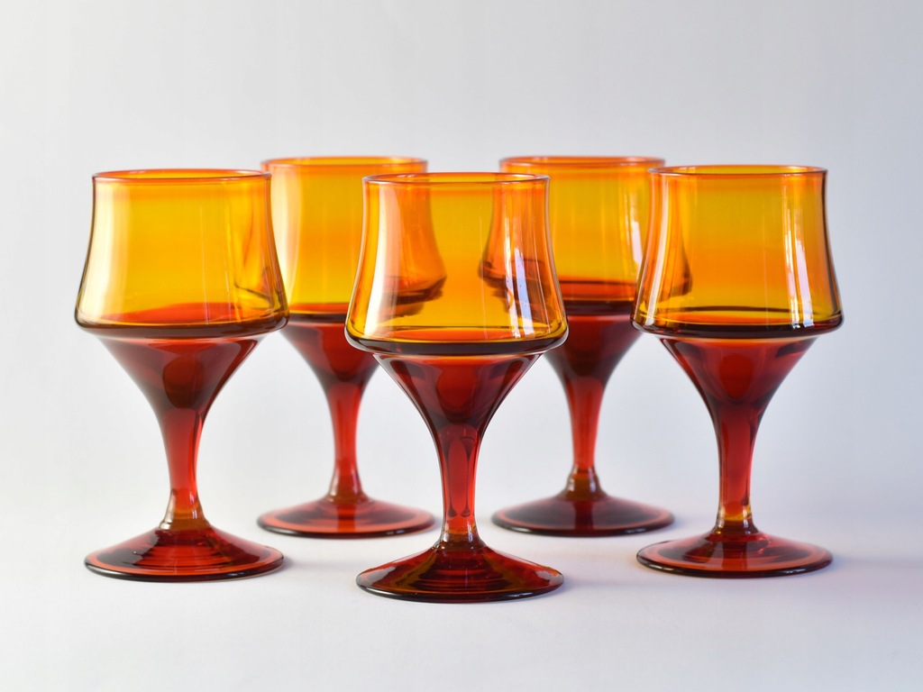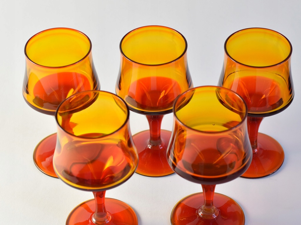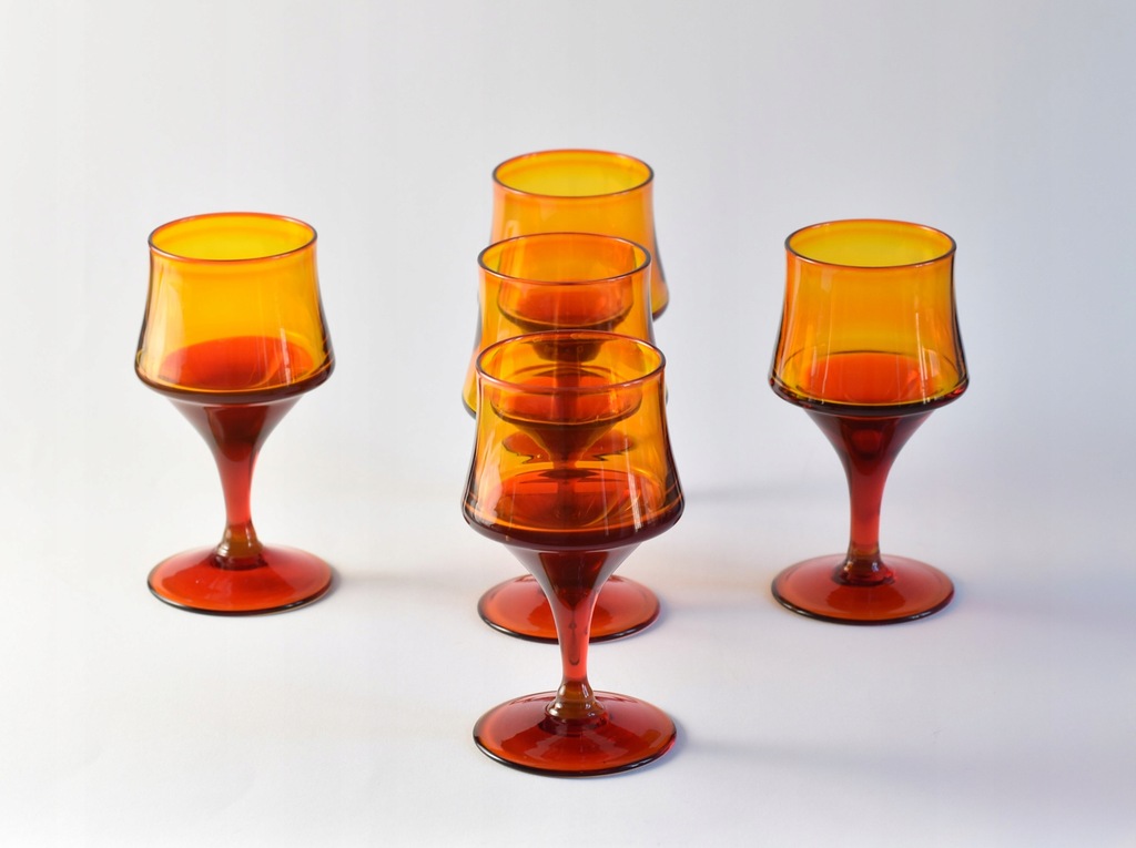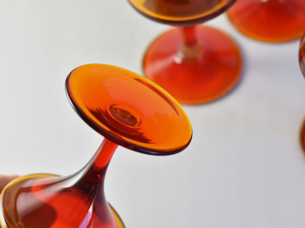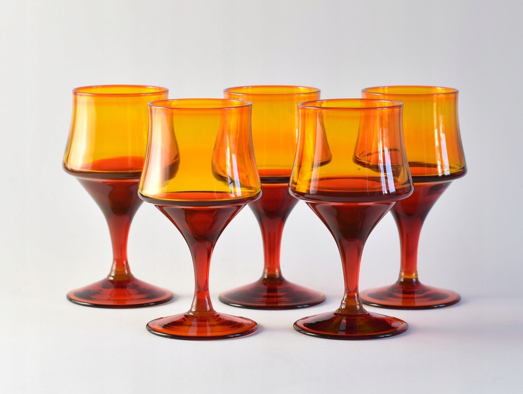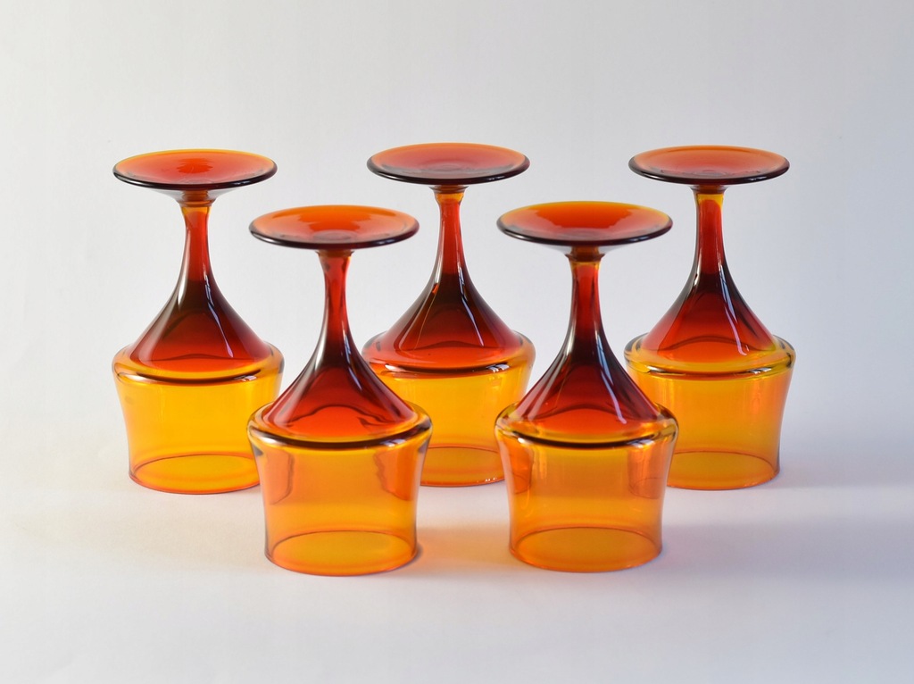 Zestaw pięciu pomarańczowo-czerwonych kieliszków projektu prof. Zbigniewa Horbowego z Huty Szkła Gospodarczego Sudety.