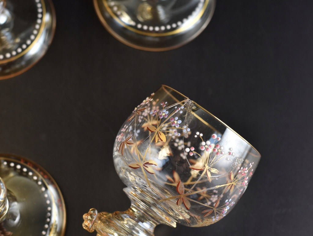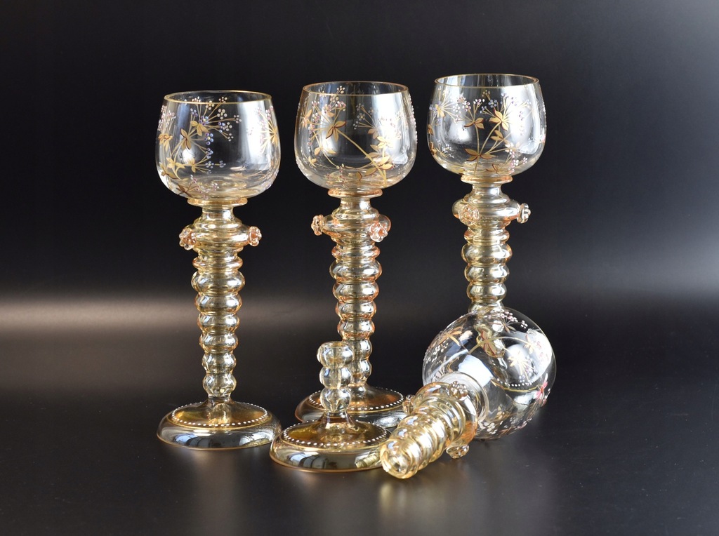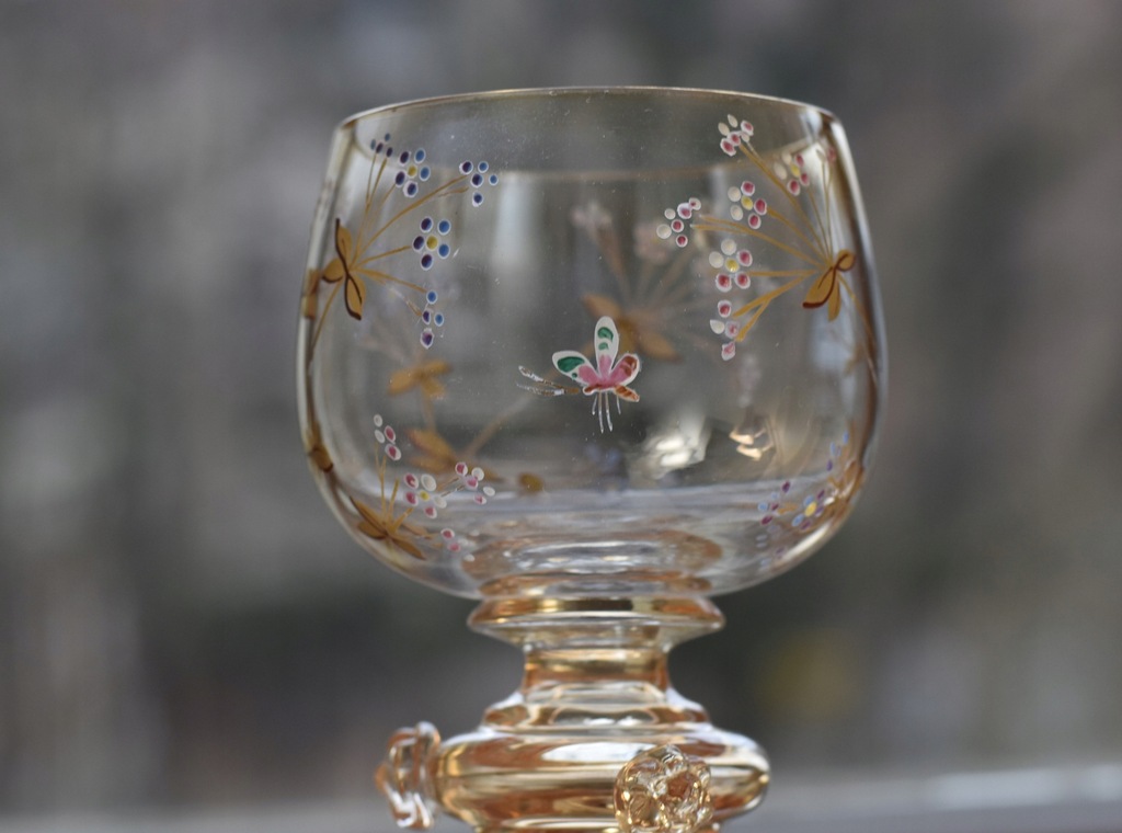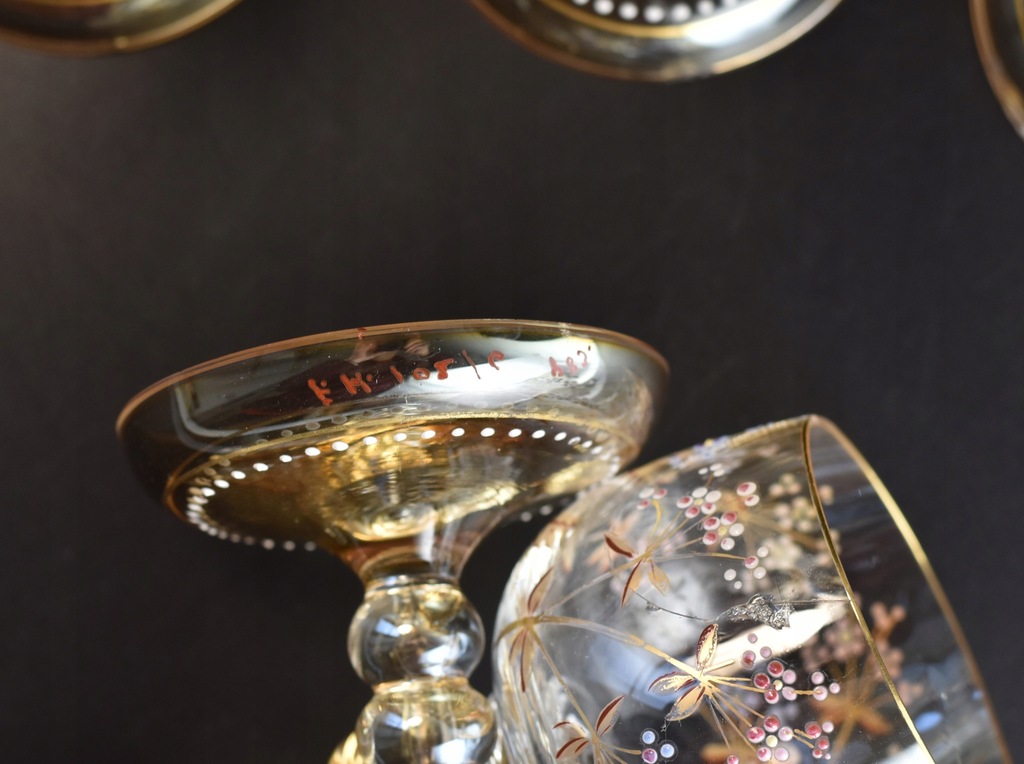 Cztery kieliszki remery z huty Fritza Heckerta, która mieściła się dawniej Piechowicach (niem. Petersdorf) na Dolnym Ślasku. Kolorowe motywy roślinne. Szkło dekorowane złoceniami i emalią.