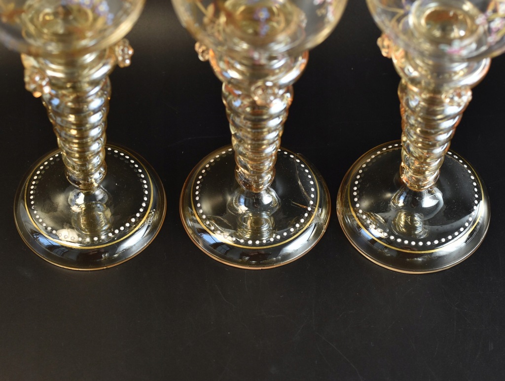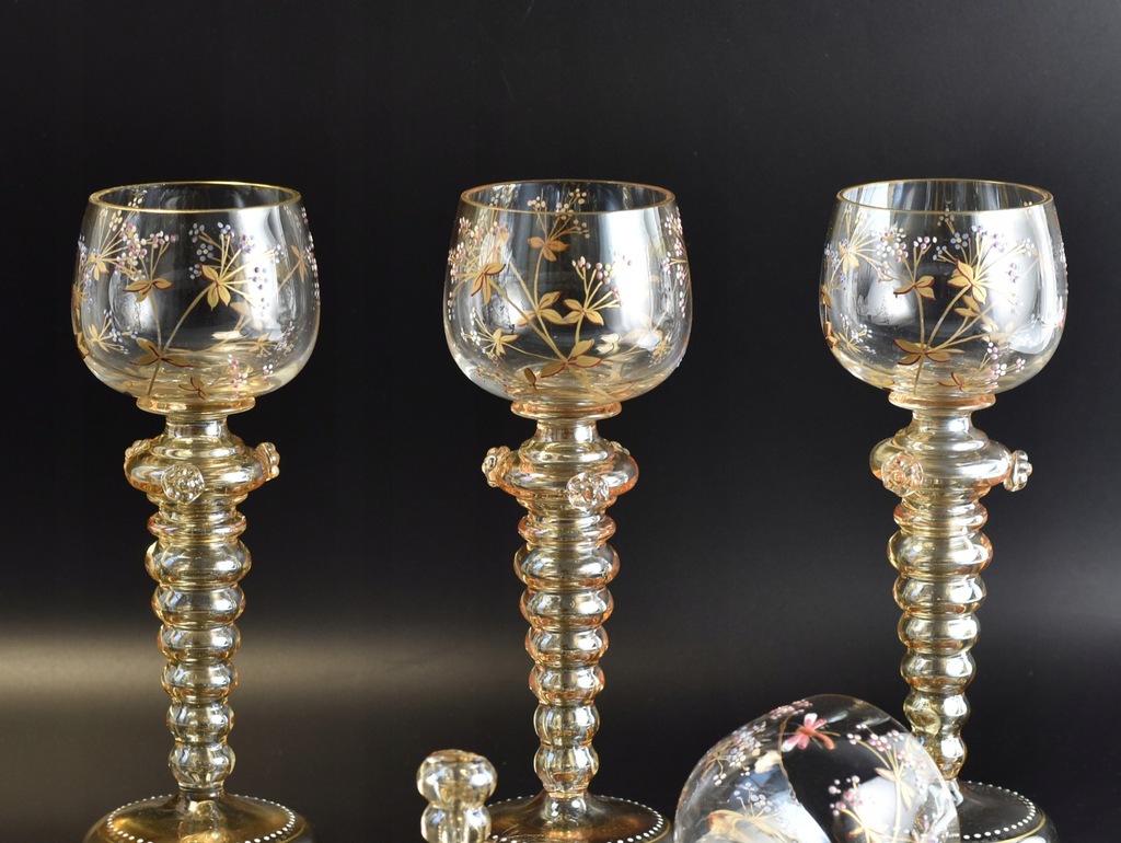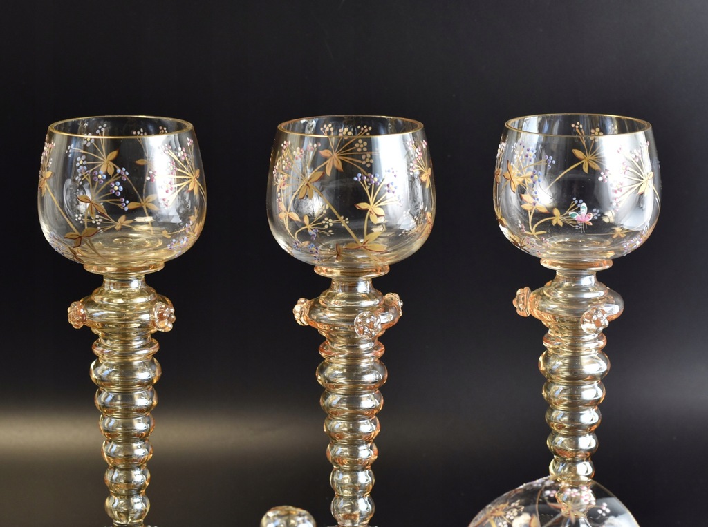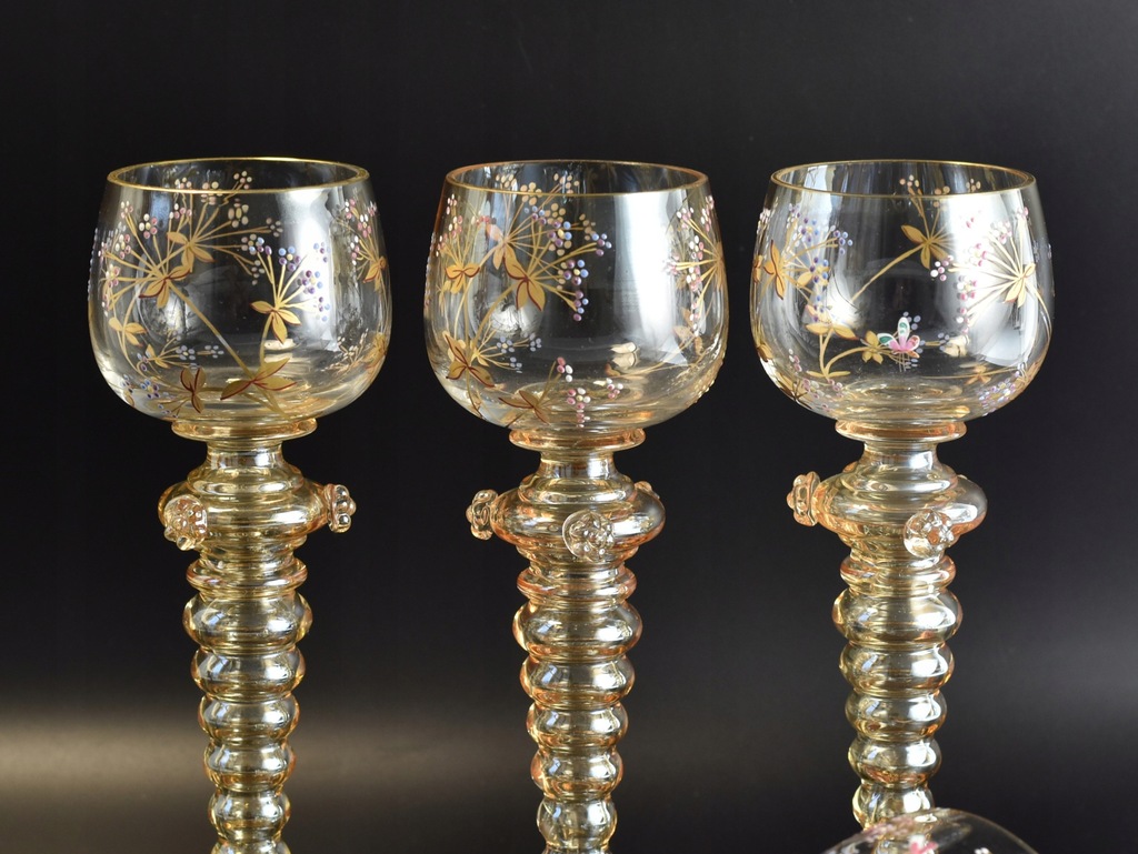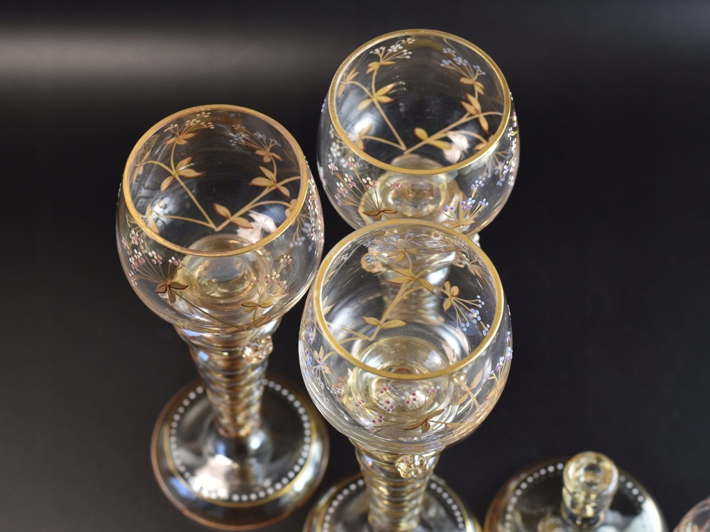 Cztery kieliszki remery z huty Fritza Heckerta, która mieściła się dawniej Piechowicach (niem. Petersdorf) na Dolnym Ślasku. Kolorowe motywy roślinne. Szkło dekorowane złoceniami i emalią.