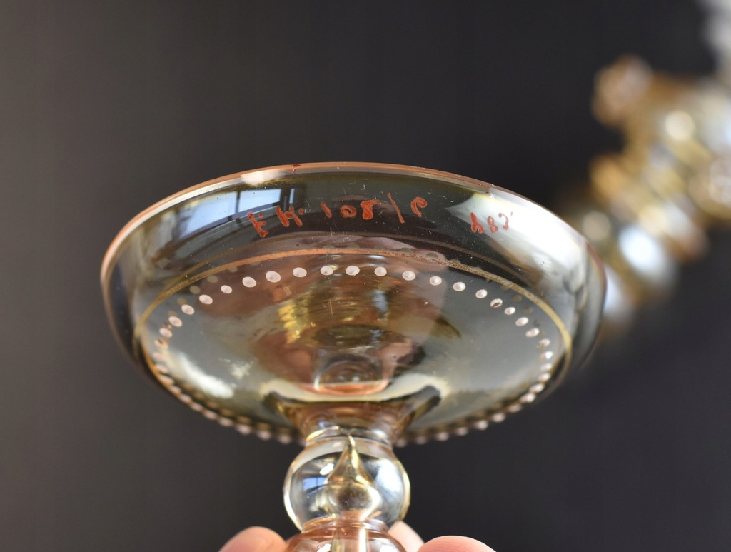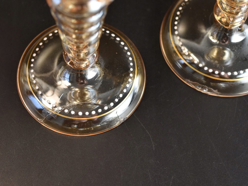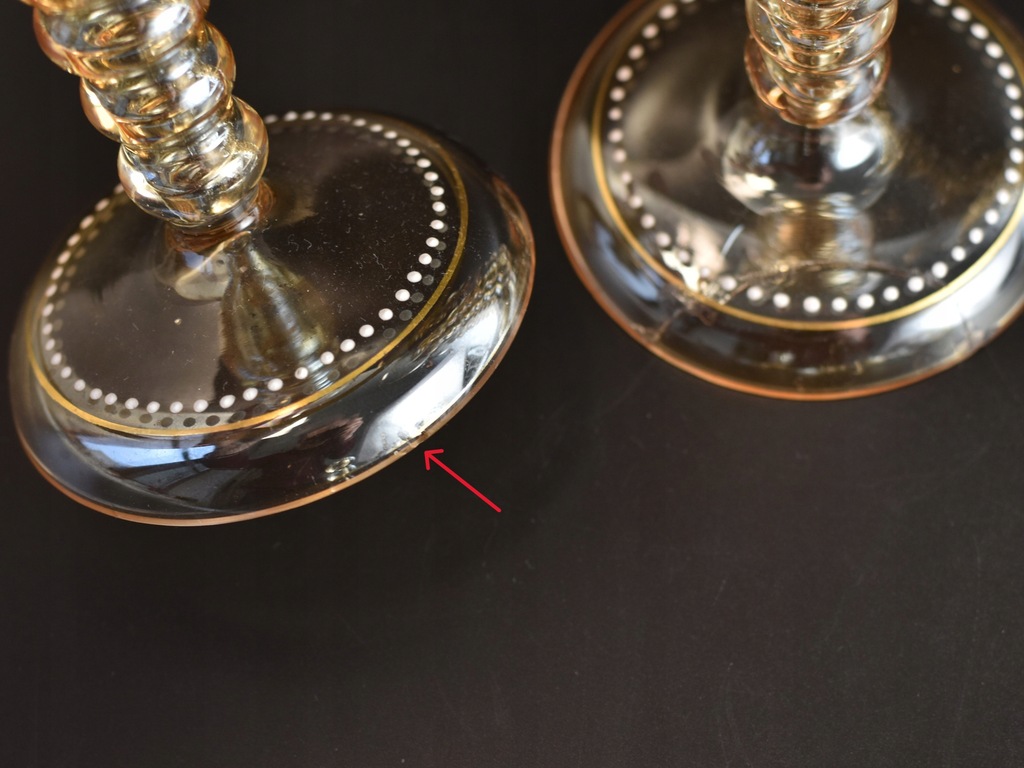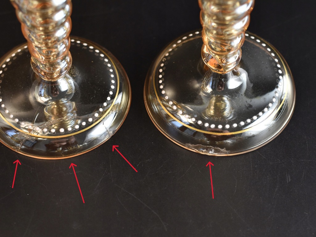Stan: trzy kieliszki mają uszkodzenia na podstawach + jeden jest uszkodzony i dodatkowo złamany, nadaje się do sklejenia (ten kieliszek jest sygnowany). Jeden kieliszek w najlepszym stanie ma tylko małe uszczypnięcia przy podstawie (wszystko pokazane na zdjęciach).