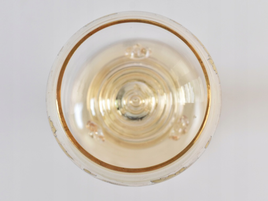 Stan: mały uszczerbek przy podstawie, poza tym kieliszek jest ładnie zachowany z normalnymi, wiekowymi śladami użytkowania / przetarciami złoceń.