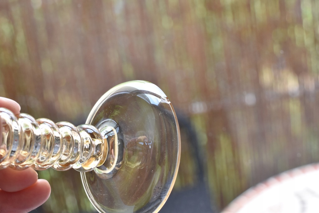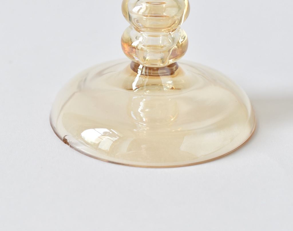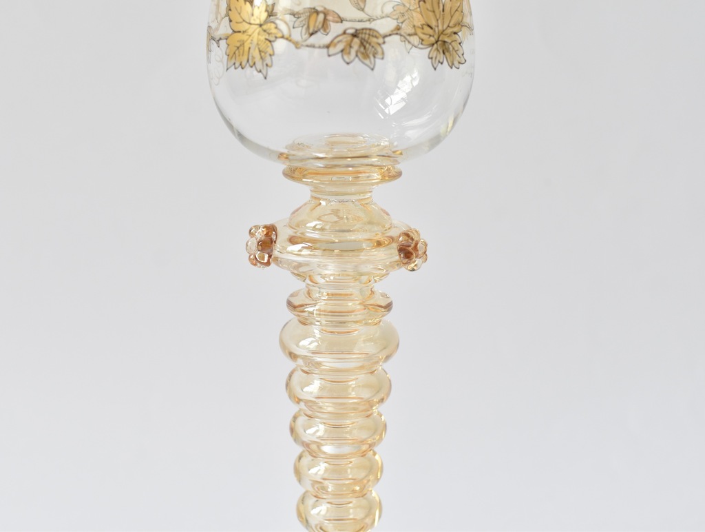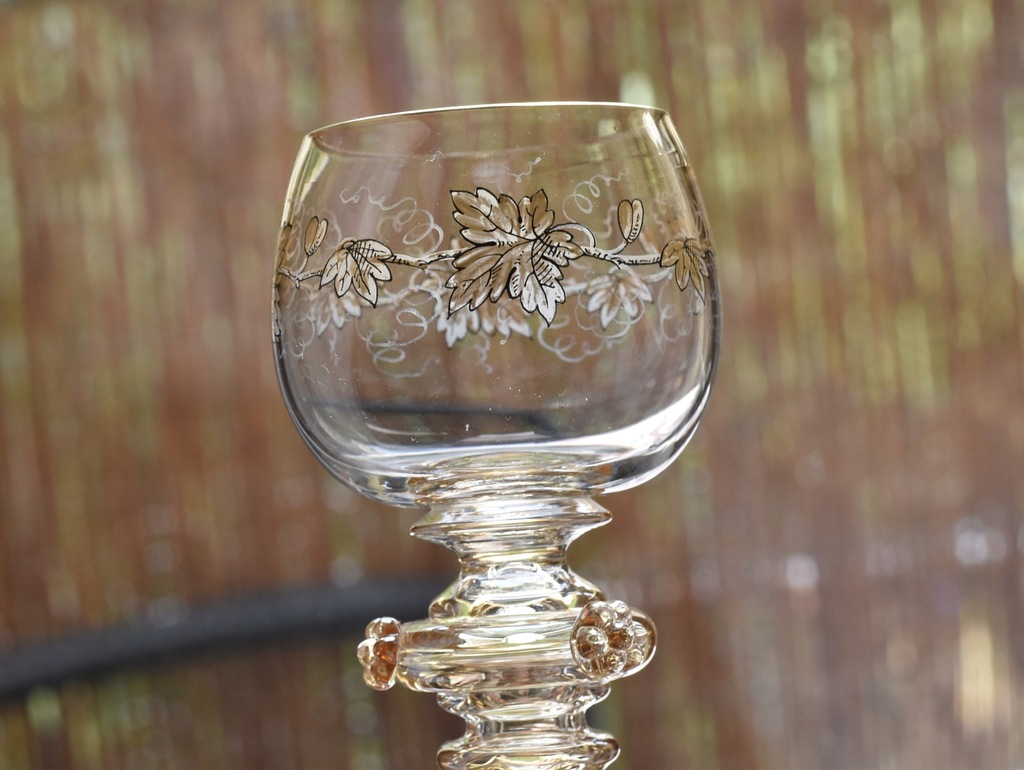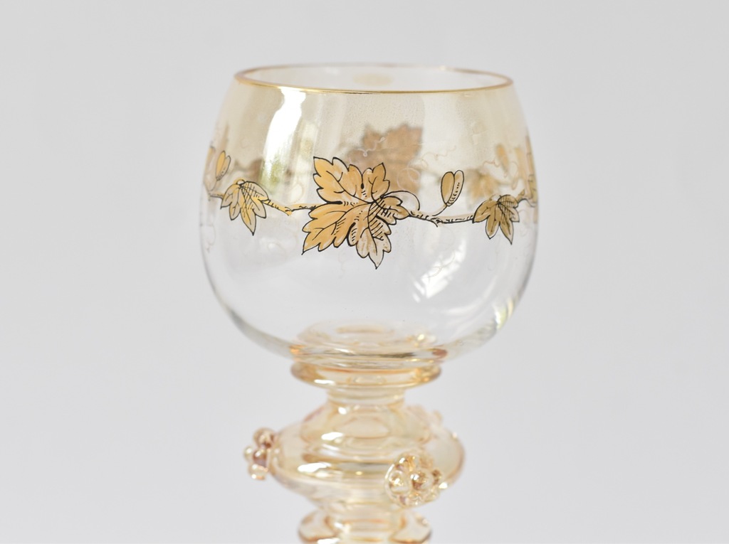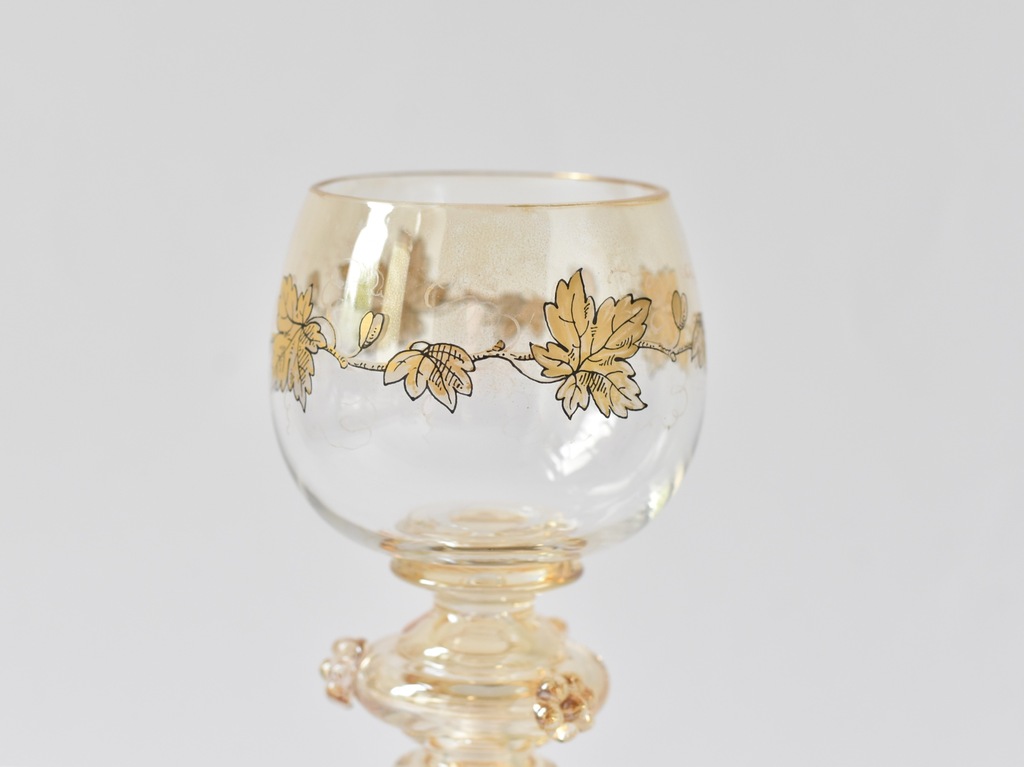 Kieliszek remer z huty Fritza Heckerta, która mieściła się dawniej Piechowicach (niem. Petersdorf) na Dolnym Ślasku. Szkło dekorowane motywem złotych gałązek winorośli.