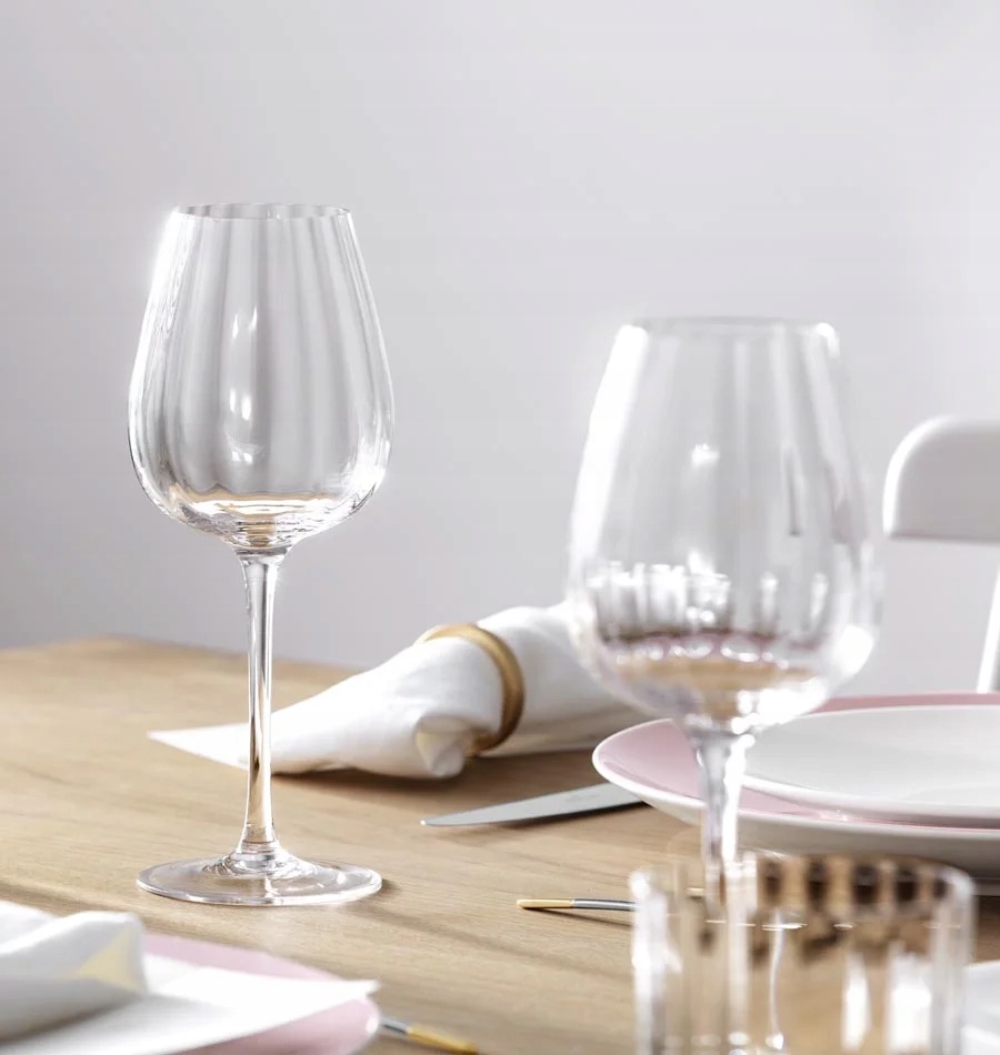 Prosta forma kieliszków Rose Garden Villeroy & Boch z delikatnymi tłoczeniami dobrze współgra z wieloma typami zastawy stołowej.