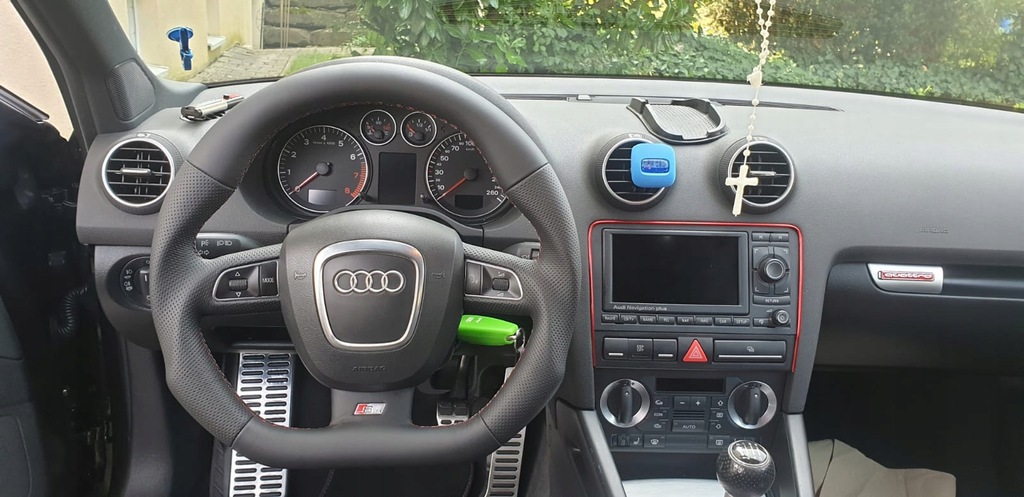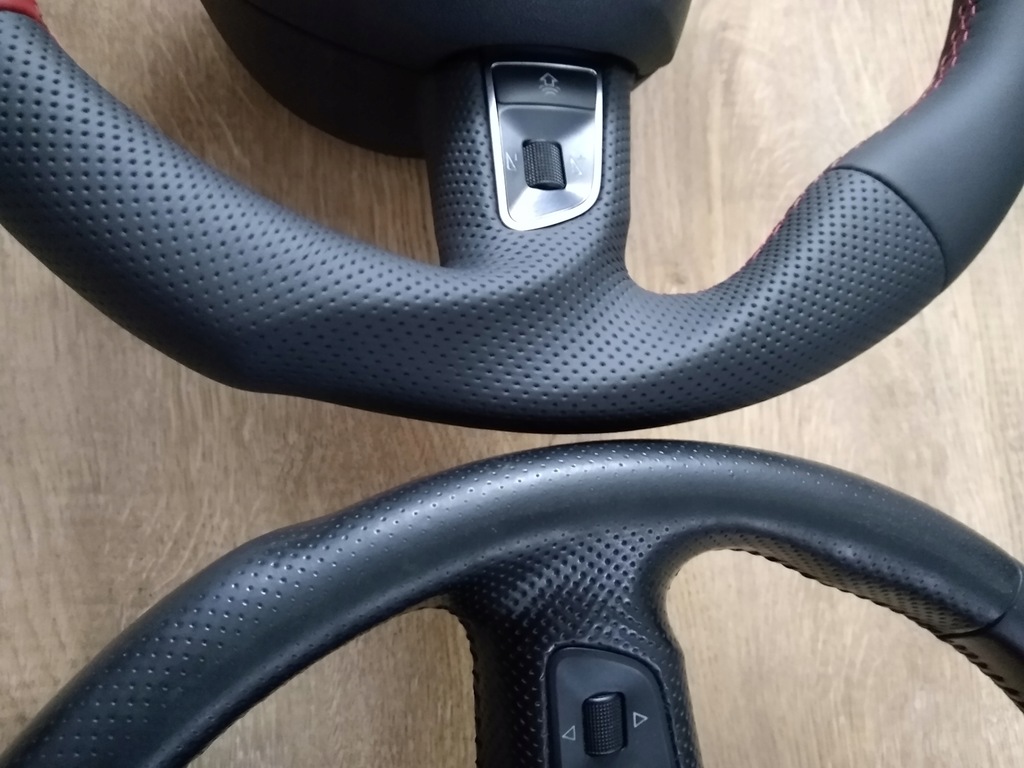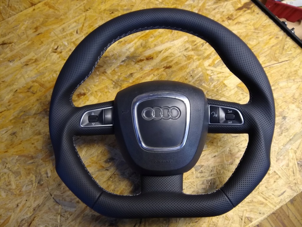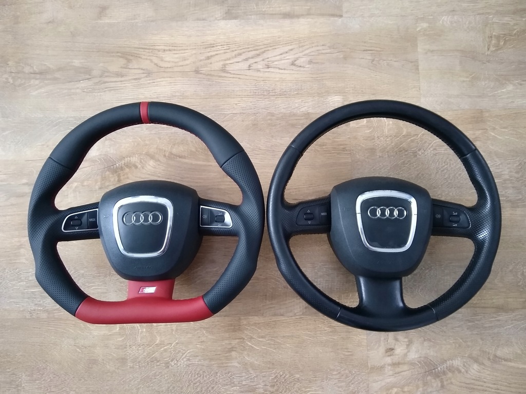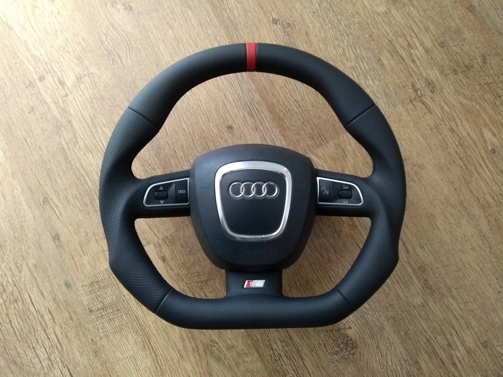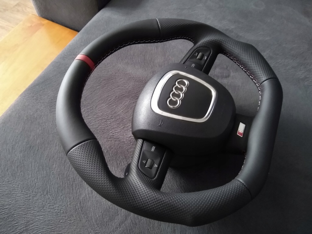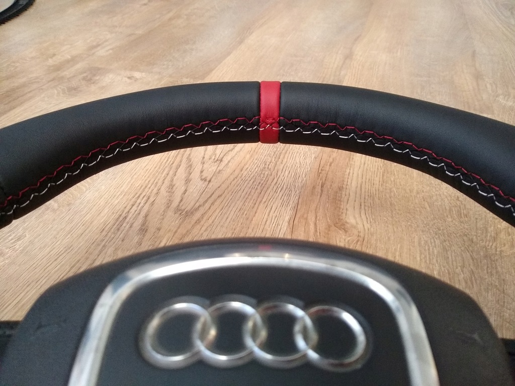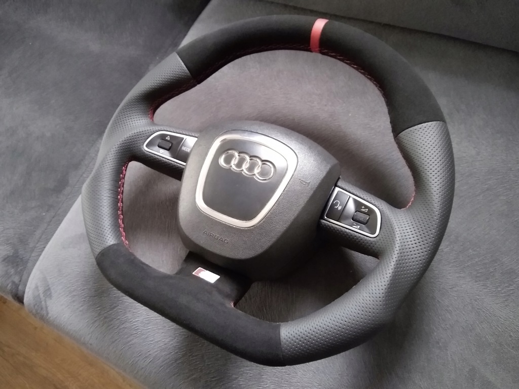 Kierownica obszyta oryginalną samochodową skórą perforowaną i gładką nappa. Kierownica nie jest wykonana ze szpachli, gipsu czy innych twardych materiałów lecz ze specjalnej gumy używanej w motoryzacji. Do wyboru normalna skóra struktura, gładka Nappa, perforowana lub alcantara, 14 kolorów nici, różne znaczki audi.