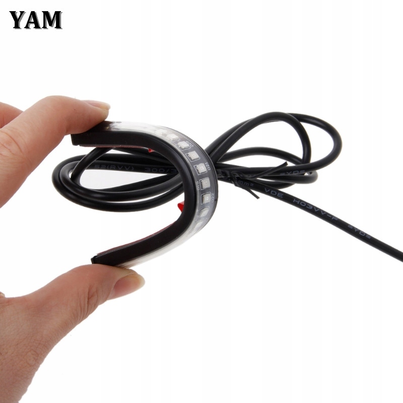 Elastyczne światło stopu i kierunkowskazu. Materiał: miękki pasek gumowy z diodami LED SMD 3528. Kolor podstawy: czarny. Materiał: żel krzemionkowy. Barwa światła: czerwona + pomarańczowa. Liczba diod LED: 18 diod LED. Napięcie: 12 V. Ilość: 1 szt. Rozmiar: 12 * 1,3 * 0,8 cm. Światło czerwone dla światła stopu , światło pomarańczowe dla sygnału kierunkowskazu. Żywotność: 50000 godzin. Zasilanie : przewód czarny: (-) masa przewód czerwony: zasilanie światła stop przewód żółty: zasilanie kierunkowskazu W 100% nowe i w wysokiej jakości , możliwość bardzo łatwego uszczelnienia dla pełnej wodoodporności. Listwa jest elastyczna umożliwiająca montaż na każdej powierzchni. Super jasny układ LED jest 8 razy jaśniejszy niż oryginalne żarówki. Zastosowanie jako światło stop oraz kierunkowskazów. Łatwo się instaluje, montujesz prawie wszędzie za pomocą taśmy dwustronnej.
