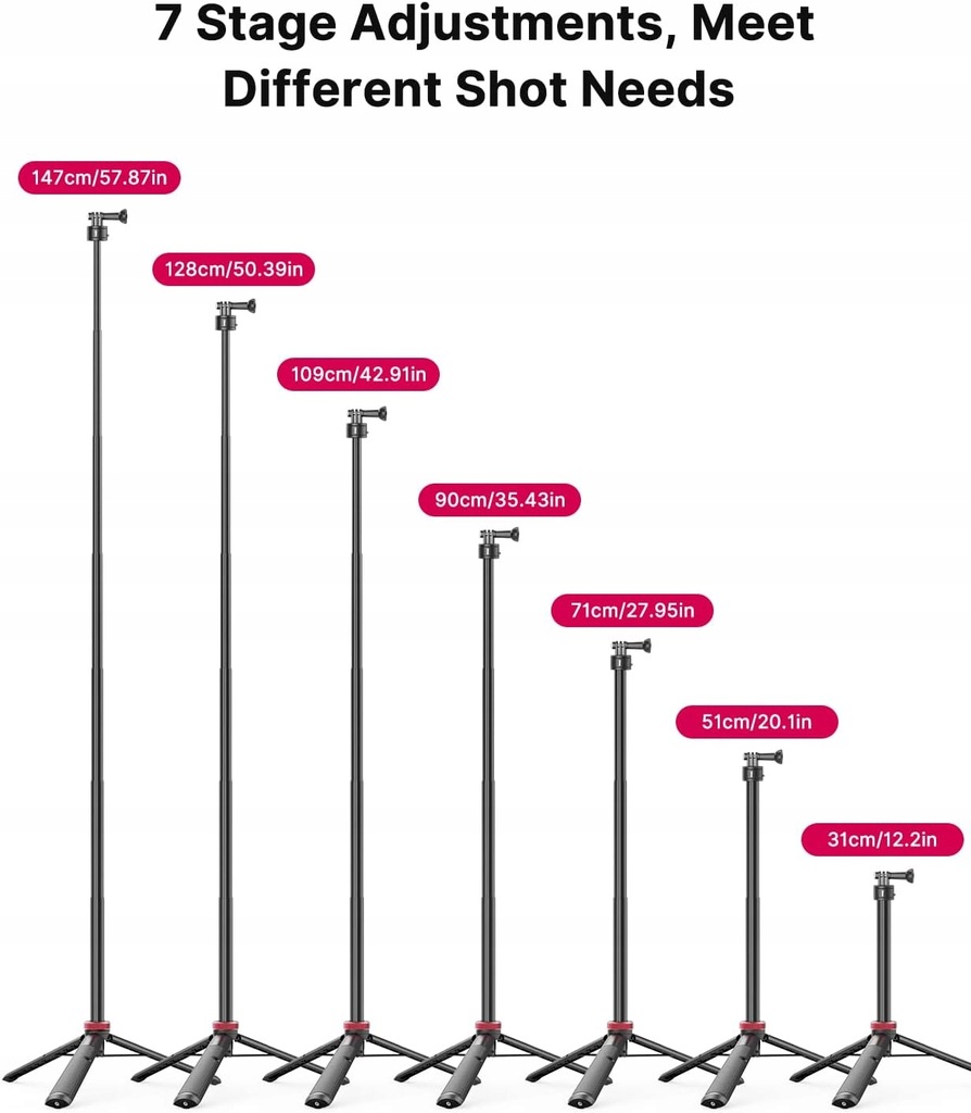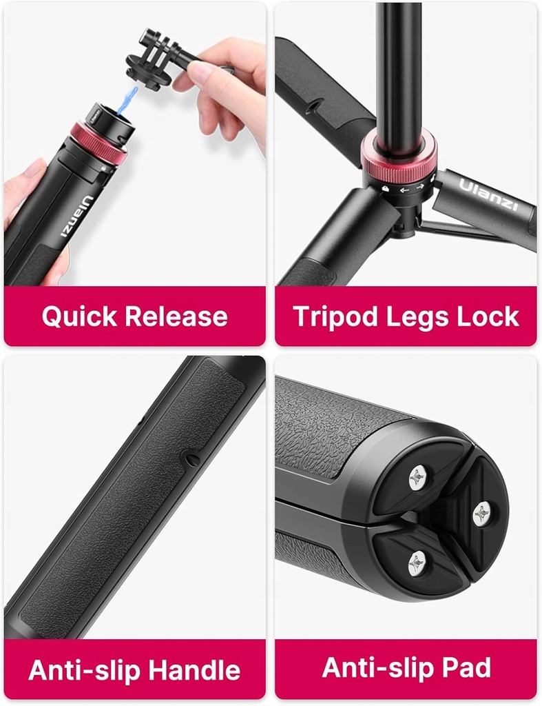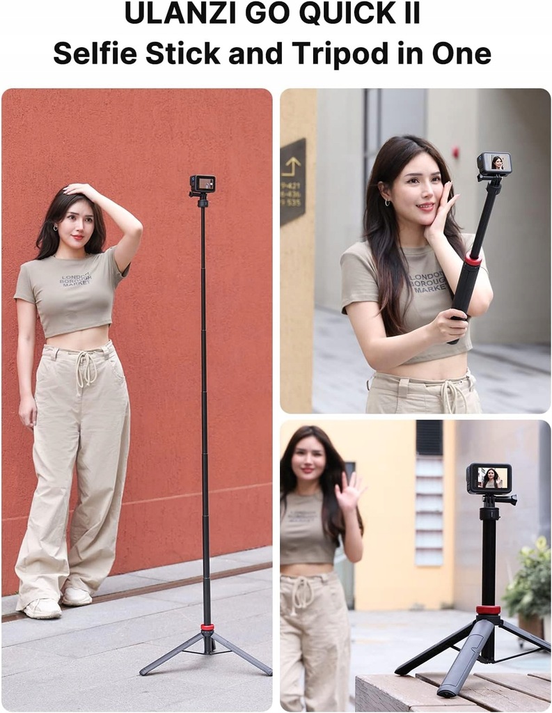 Statyw Ulanzi Go Quick II ułatwia vlogowanie oraz szybkie mocowanie kamerek sportowych. Zapewnia stabilny obraz, a magnetyczna szybko-złączka ekspresowe mocowanie kamerki. Przykładasz, przekręcasz i gotowe. Silny magnes z dodatkową blokadą skutecznie pilnuje, aby Twój sprzęt nie odczepił się podczas filmowania. Statyw może pełnić również rolę kijka do selfie. Dzięki temu nagrywanie i robienie ujęć selfie stanie się łatwiejsze. Już nie musisz nikogo prosić o zrobienie Ci zdjęcia oraz uzyskasz ujęcia z odległości większej niż zasięg ręki. Dzięki sześciostopniowej regulacji płynnie zmieniasz długość kijka w zakresie od 25 cm aż do 140 cm. Trzecią funkcją jest uchwyt ręczny, czyli grip.