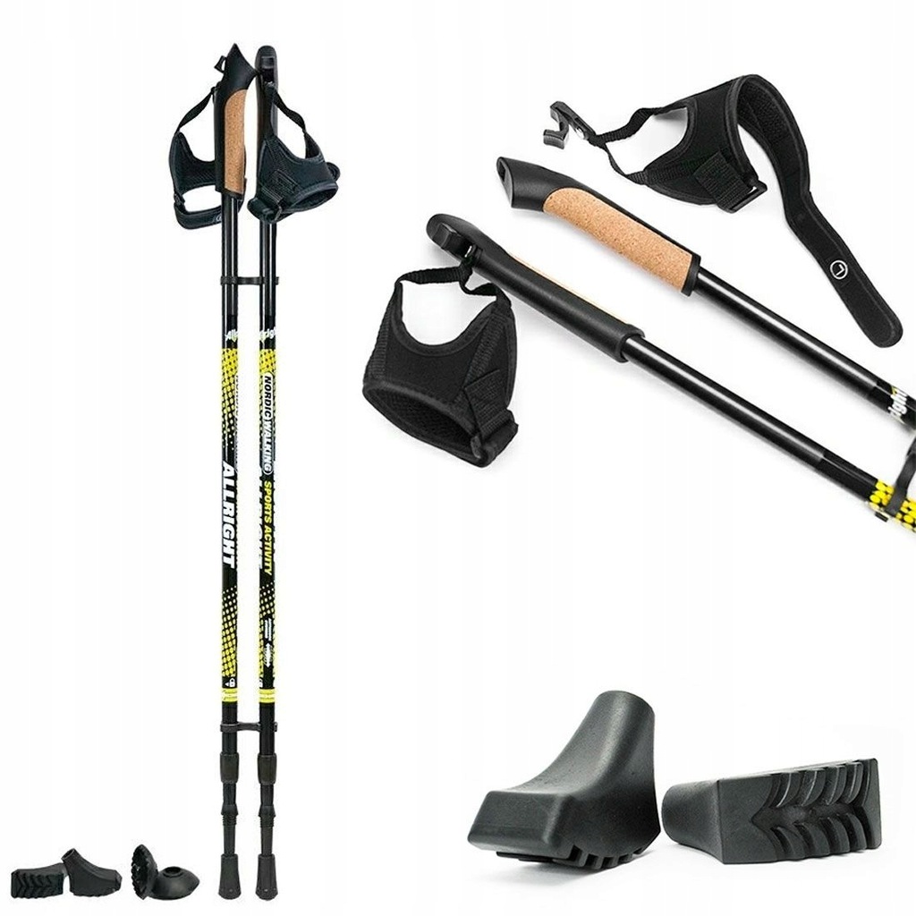 Wysokiej jakości, lekkie, aluminiowe, dwuczęściowe, składane kijki Nordic Walking marki Allright. Posiadają system amortyzujący wstrząsy - ANTI-SHOCK oraz możliwość jego wyłączenia. Ergonomiczna rękojeść pokryta została warstwą naturalnego korka oraz wyposażona w zapięcie na nadgarstek na rzep - tzw. rękawiczka. Dodatkowo w komplecie znajduje się zestaw nasadek.