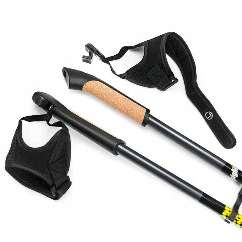 SPECYFIKACJA: - 2-częściowe teleskopowe - wykonane z aluminium; średnica 16/14 mm - system amortyzujący ANTI-SHOCK z blokadą - długość 85 - 135 cm - ergonomiczna rękojeść z korka - odpinana rękawiczka z onaczeniem prawa/lewa - dodatkowy komplet nasadek - waga: ok 500g