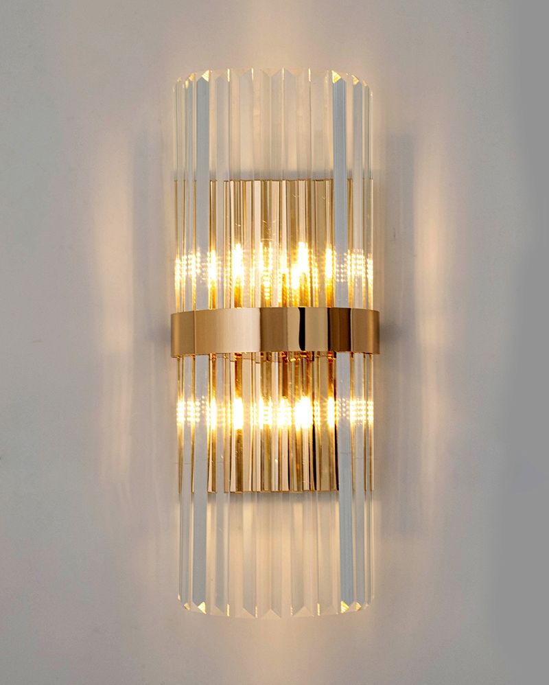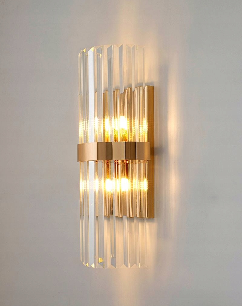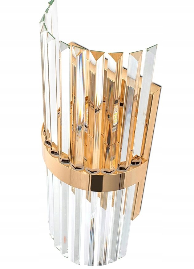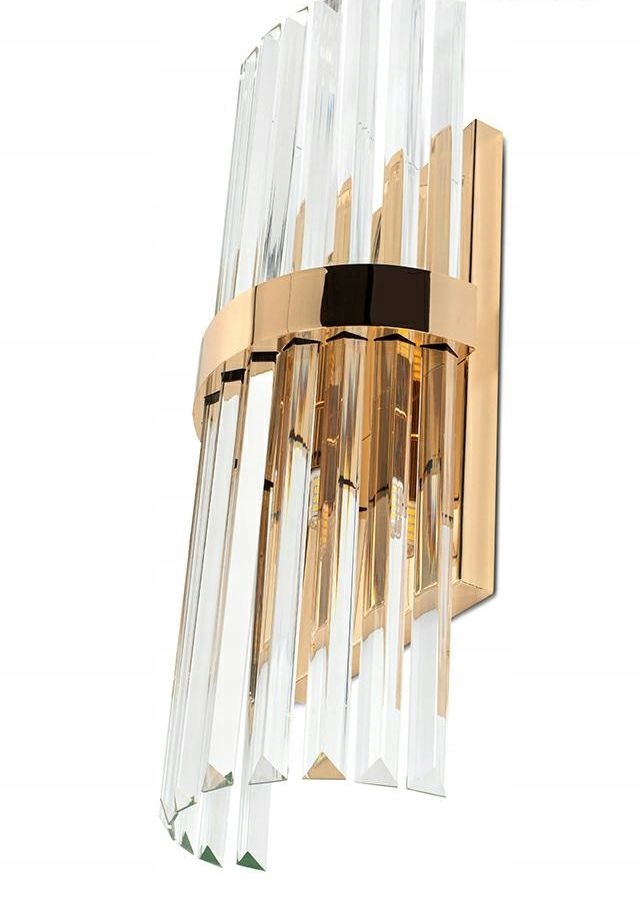 Konstrukcja lampy oraz element łączący piękne kryształowe klosze wykonane zostały ze stali w kolorze złotym. Klosze w takiej odsłonie odbijając światło, tworząc niesamowity efekt wizualny na ścianie.