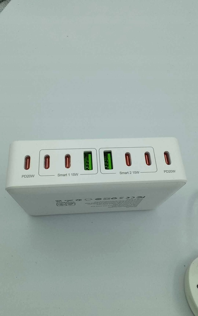- Inteligentny chip i inteligentna dystrybucja mocy: 2 porty USB-A i cztery porty USB C obok nich generują maksymalnie 12 W (5 V/2,4 A), gdy są używane osobno. Gdy tych 6 portów jest używanych jednocześnie, adapter USB C automatycznie wykrywa wszystkie podłączone urządzenia i odpowiednio dostosowuje moc wyjściową, aby zminimalizować czas ładowania każdego urządzenia.