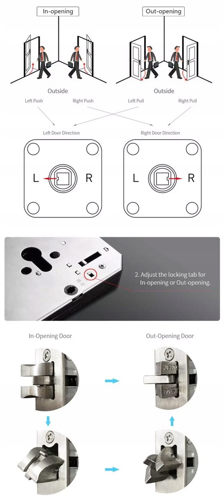 Klamka jest uniwersalna, ustawiona w prawą stronę. Klamkę i zamek można przestawiać do pracy dla każdego rodzaju otwierania drzwi: