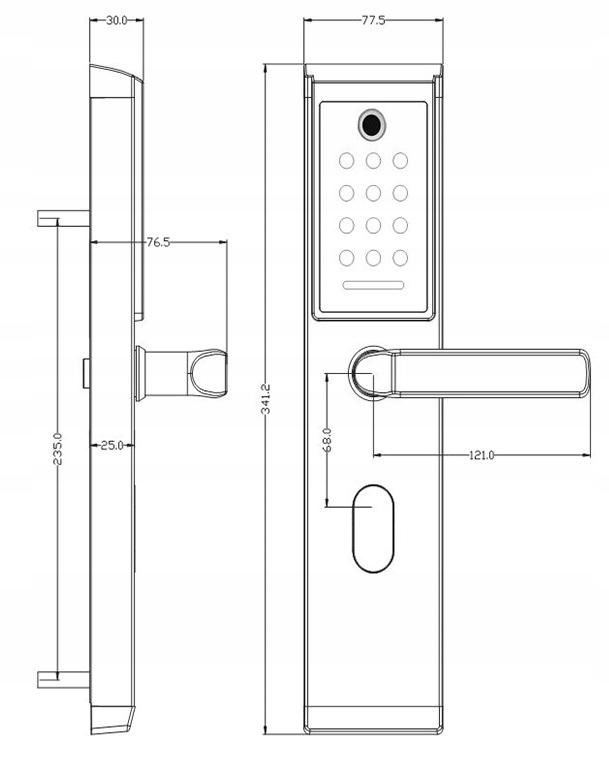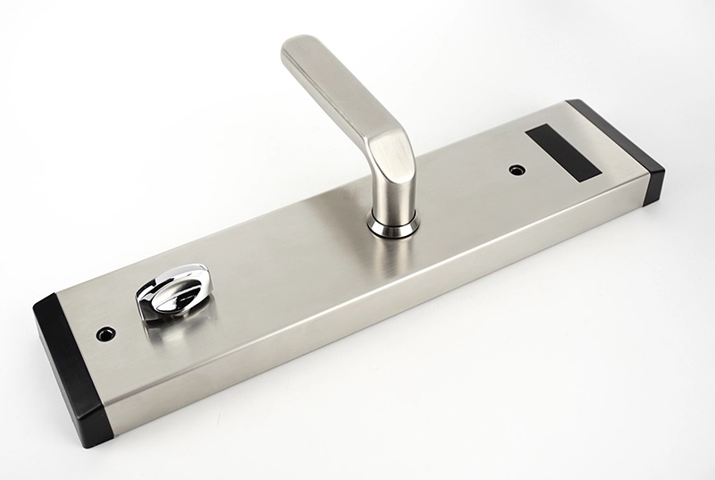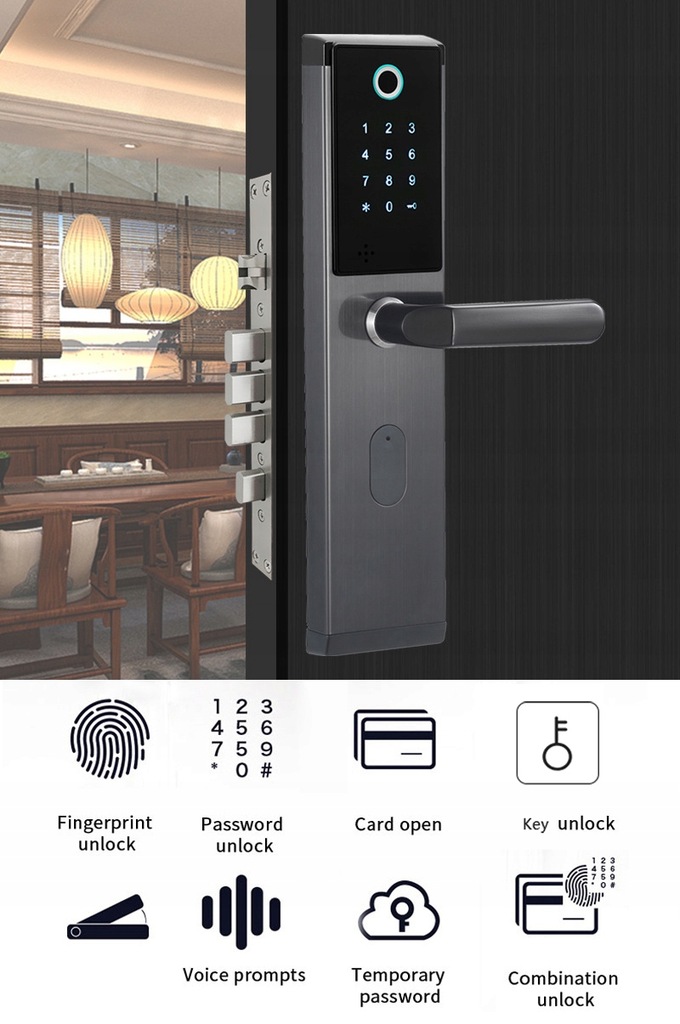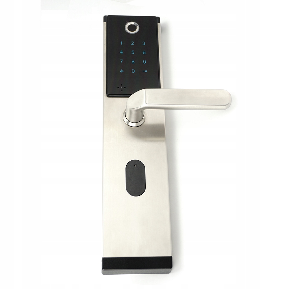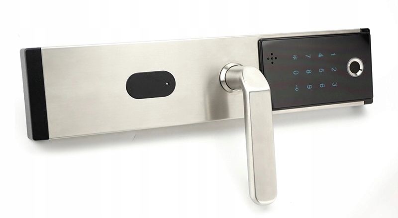 Metalowy zamek szyfrowy kodowy - klamka z czytnikiem odcisku palca, zamkiem elektromechanicznym, czytnikiem RFID i klawiaturą kodową dotykową