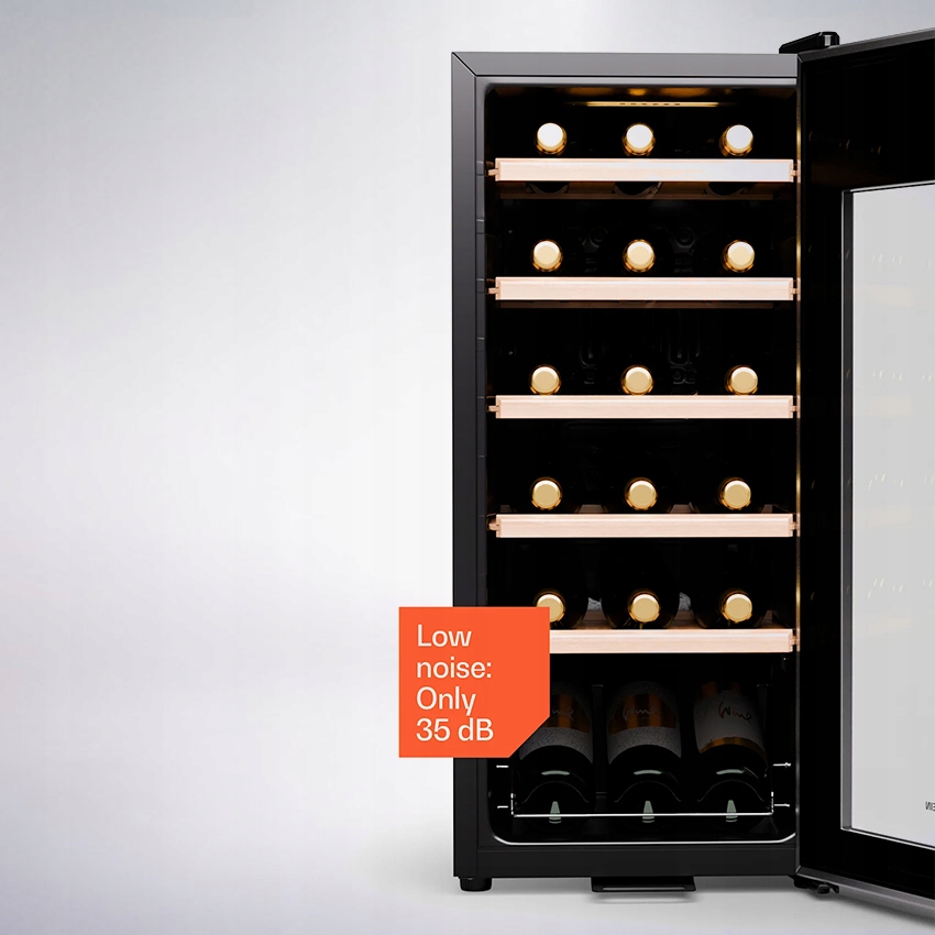 Temperaturę można ustawić w zakresie od 5 do 18 stopni Celsjusza, co jest idealne do przechowywania różnych rodzajów wina. Pięć drewnianych półek oferuje prostą i elegancką opcję przechowywania. Cicha praca chłodziarki zapewnia optymalne dojrzewanie win, a ochrona przed promieniowaniem UV chroni je przed niepożądanymi wpływami.