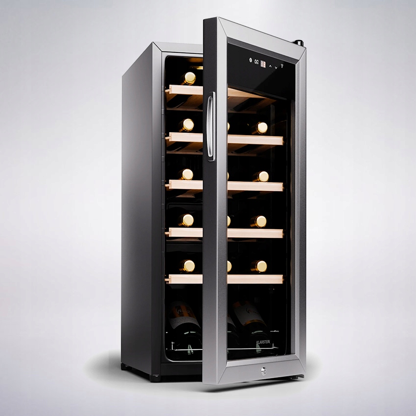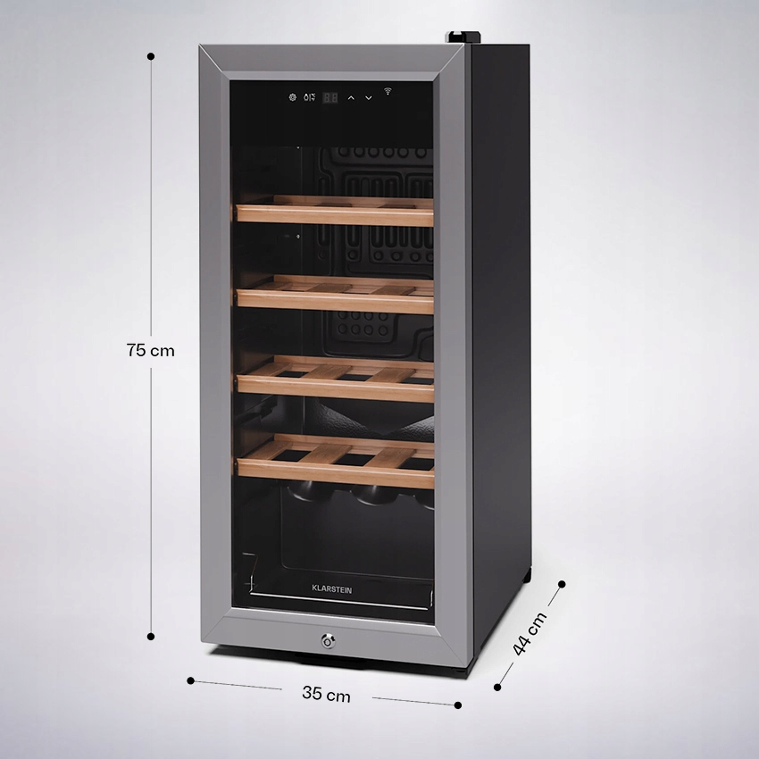 Chłodziarka na wino Shiraz Premium Smart 18 marki Klarstein to nie tylko elegancki, ale i inteligentny wybór dla miłośników wina. Dzięki dużej pojemności 18 butelek zapewnia wystarczającą ilość miejsca i przyciąga wzrok dzięki eleganckiemu wzornictwu.