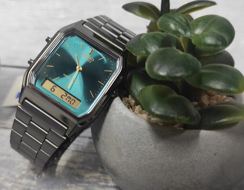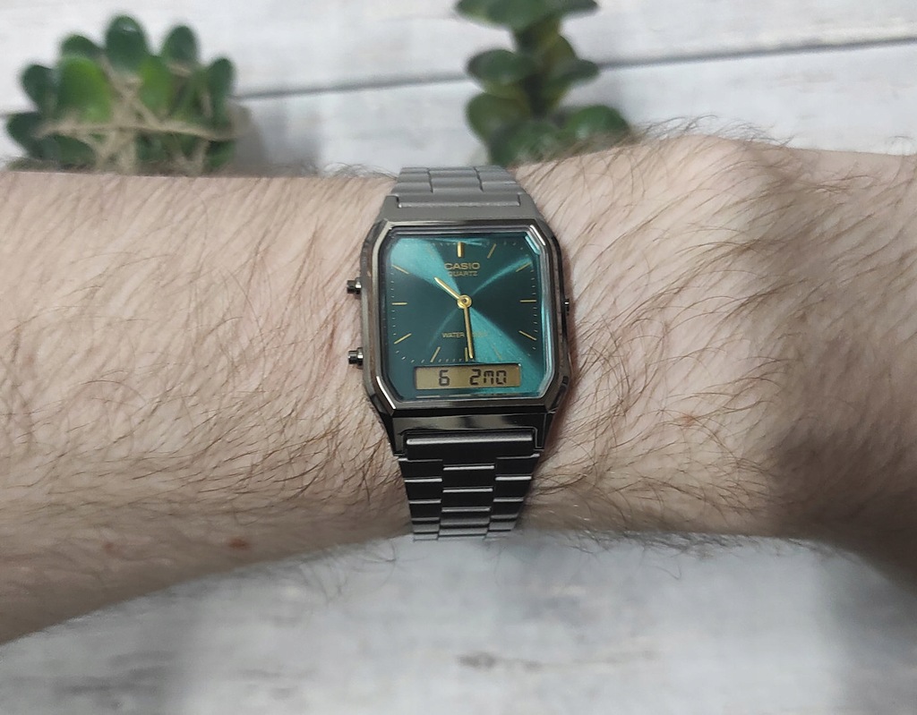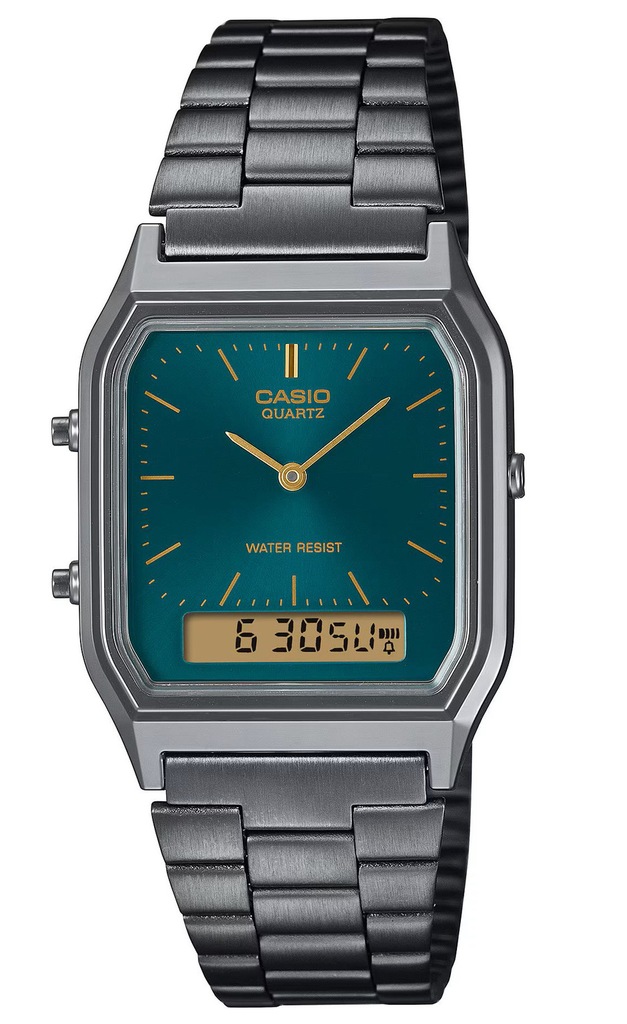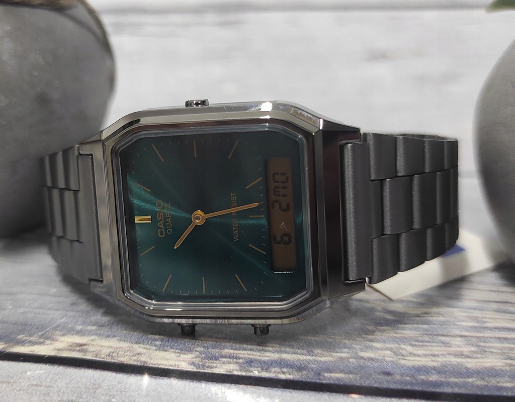 Klasyczny analogowo-cyfrowy zegarek Casio Retro AQ-230EGG-3AE. Szara koperta z tworzywa, szara stalowa bransoleta, zielona tarcza, klasa szczelności WR, alarm, stoper
