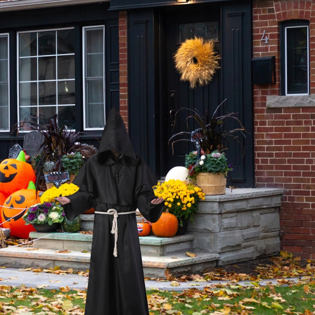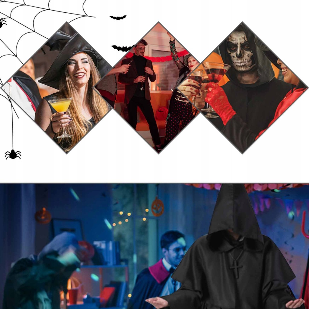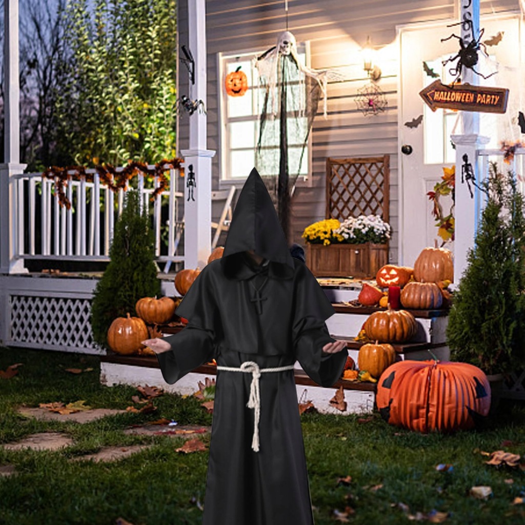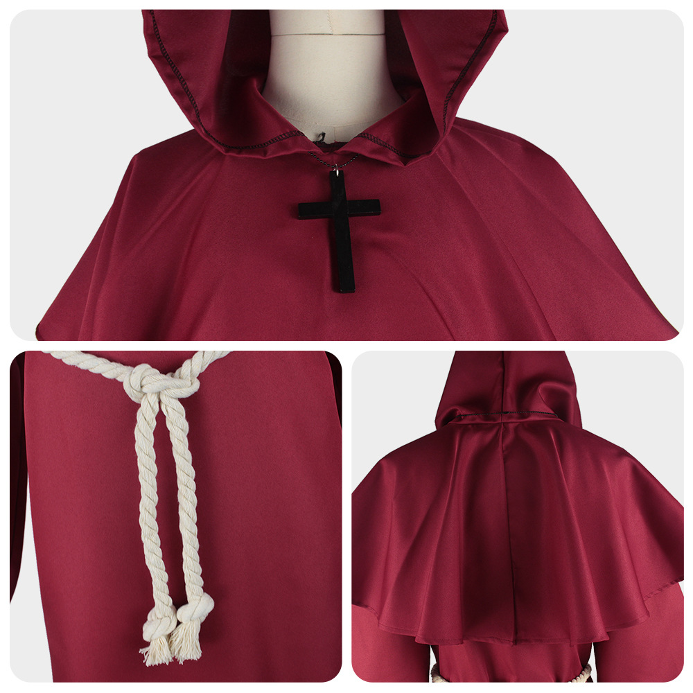 Nasz kostium mnicha składa się z obszernego płaszcza z kapturem, który zakrywa twarz i sprawia, że wyglądasz bardziej tajemniczo, w połączeniu z naszyjnikiem z krzyżem i dużym, grubym paskiem, aby uzyskać bardziej spójny wygląd i z łatwością stworzyć przerażający efekt.