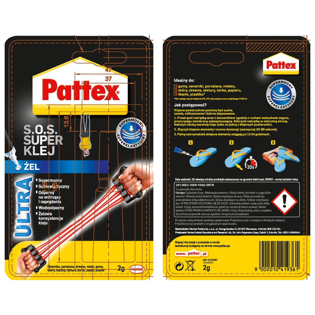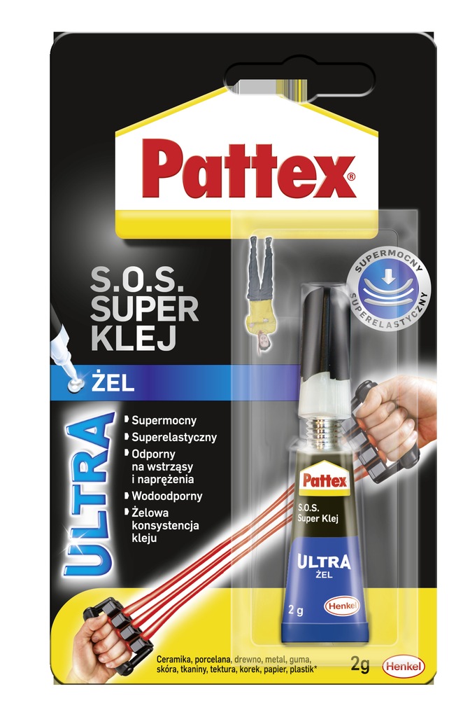 Pattex S.O.S. Super Klej Power Żel jest supermocnym i superelastycznym klejem cyjanoakrylowym o uniwersalnym zastosowaniu. Dzięki żelowej konsystencji klej nie kapie i można go stosować na pionowych powierzchniach. Idealnie nadaje się do materiałów i połączeń narażonych na zginanie.