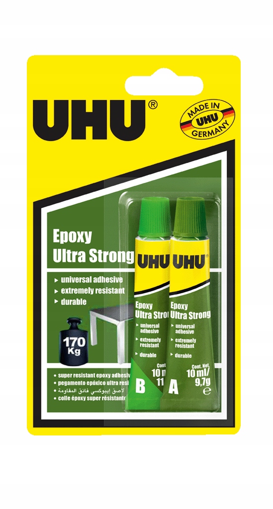 Zwiększ trwałość i wytrzymałość swoich projektów dzięki Klejowi UHU Epoxy Ultra Strong. Niezawodna siła wiązania i odporność na ekstremalne warunki sprawiają, że to idealny wybór dla każdego majsterkowicza. • Ekstremalna wytrzymałość, wiązanie aż 170 kg/cm² • Szybki czas schnięcia, gotowy do użytku w zaledwie 90 minut • Odporność na wodę i wysokie temperatury