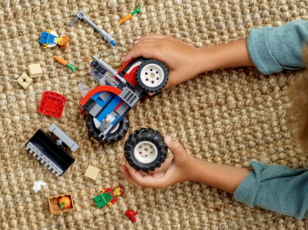 Podaruj dziecku traktor LEGO® City (60287), który rozbudzi jego wyobraźnię! W tej wyjątkowej zabawce nie brakuje realistycznych detali — są tam wielkie tylne koła, ruchoma łyżka do ładowania i podnoszony wysięgnik. W pudełku dzieci znajdą też minifigurki farmera i jego córki, figurkę królika, dwie bele siana i skrzynkę warzyw, więc zabawa w farmę na pewno będzie udana.