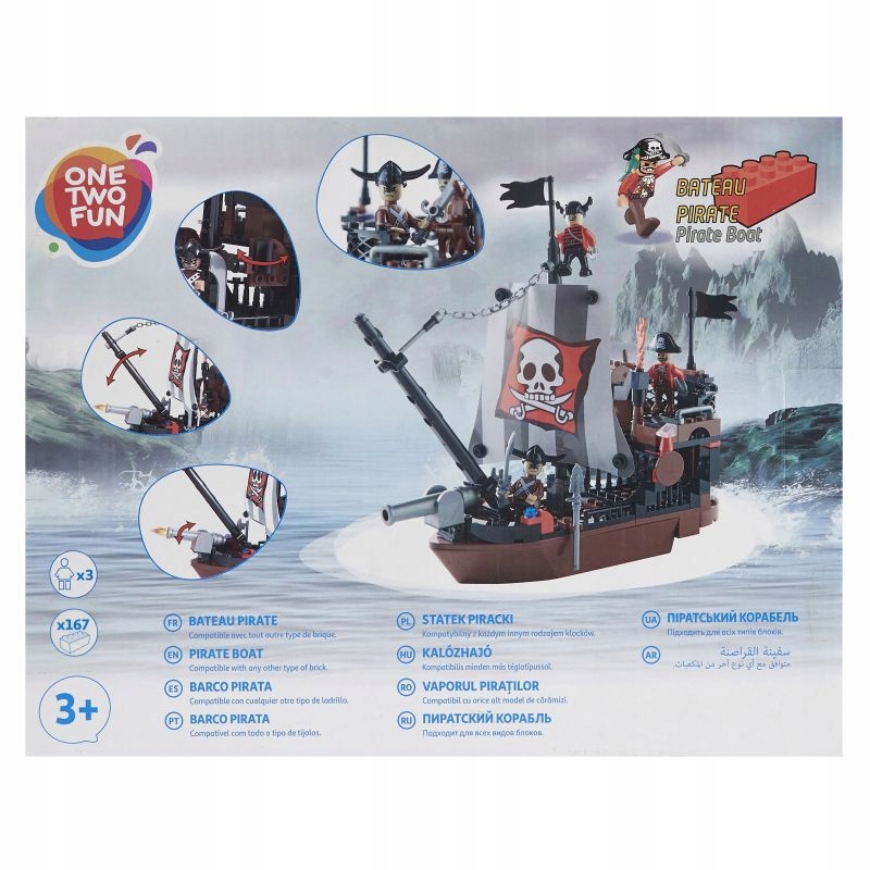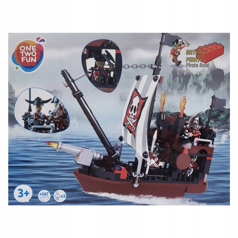 Zbuduj swój wymarzony statek piracki i poczuj zew morskich przygód. Wciel się w rolę pirata i wypłyń na pełne morze.Ten zestaw klocków One Two Fun, to idealny prezent dla miłośnika piratów i morskich przygód,Zestaw składa się ze 167 elementów, 3 figurek i jest kompatybilny z każdymi innym rodzajem klocków,