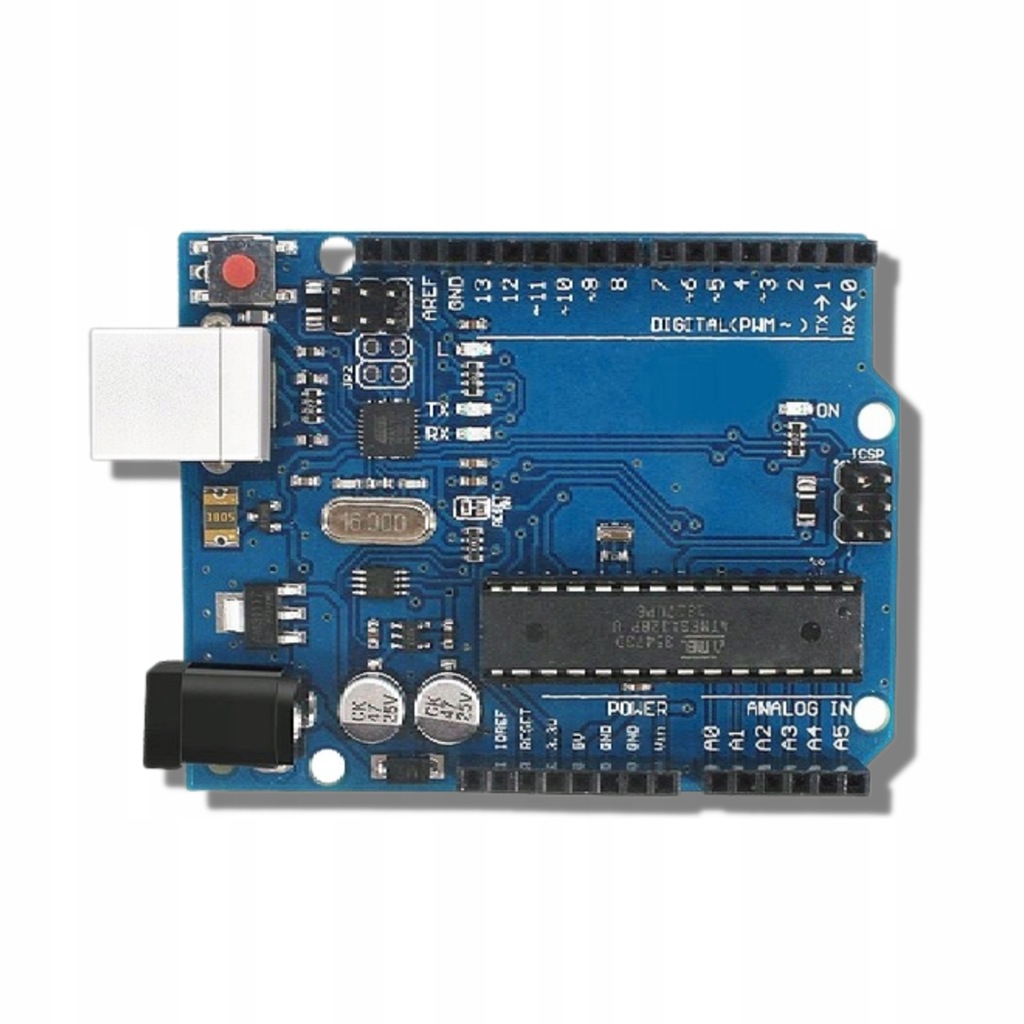 Klon Uno R3 to najbardziej popularny minikomputer do nauki elektroniki i programowania. Wyposażony w układ ATmega328P (czyli mózg całego układu) z taktowaniem 16MHz. Płytka może być wykorzystywana do wielu projektów.