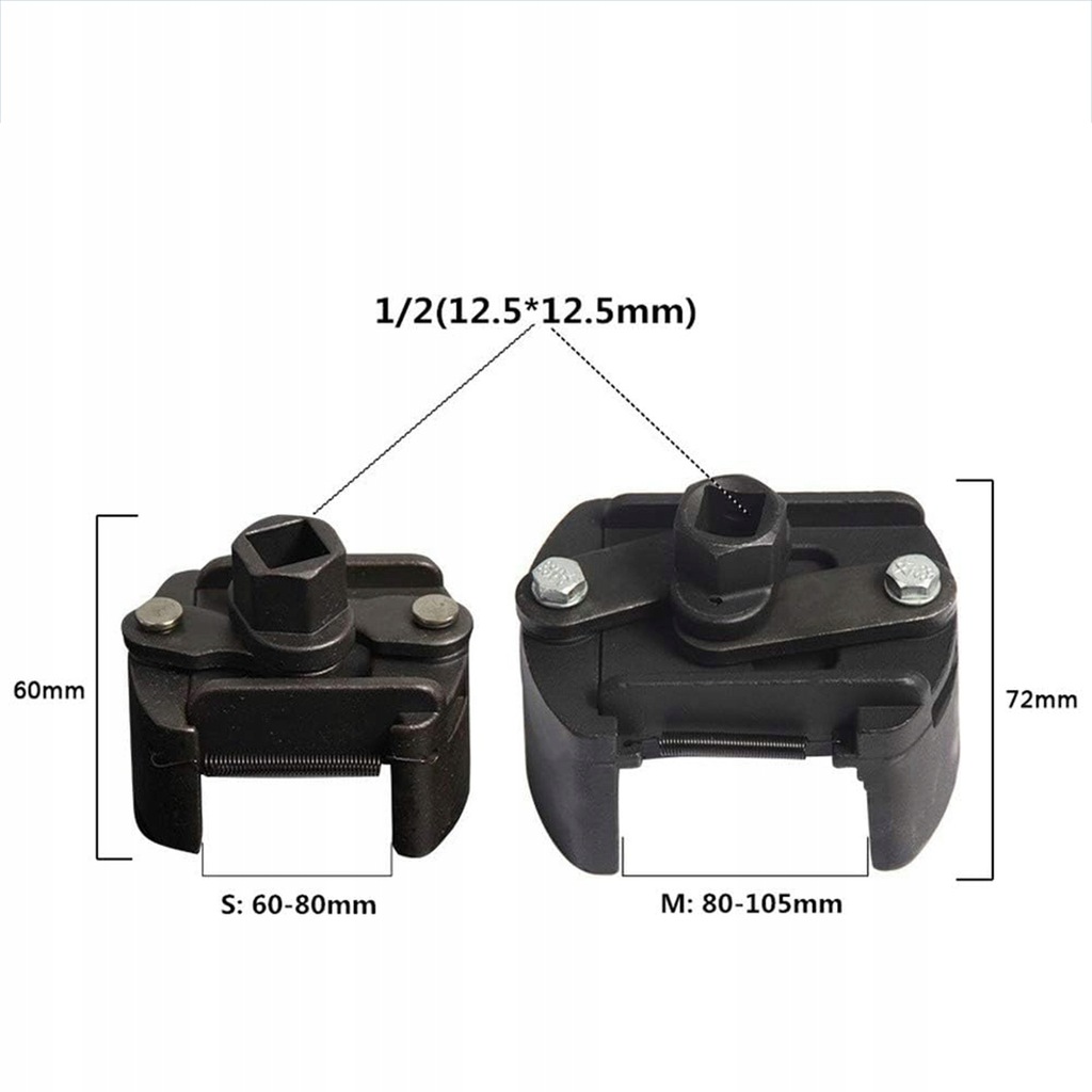 klucz do filtra oleju ma wymiary ok. 60 x 55 x 60 mm (dł. x szer. x wys.), a zakres regulacji wynosi 60-80 mm. Należy go używać z narzędziami kwadratowymi 1/2 cala (12,5 x 12,5 mm).