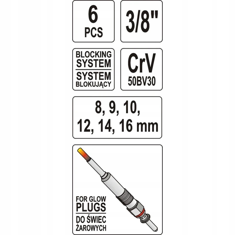 Klucze wykonane ze stali chromowo-wanadowej o symbolu CrV 50BV30 Specjalna konstrukcja klucza z przegubem i oringiem zabezpieczającym pozwala na łatwy demontaż świec żarowych, nawet w trudno dostępnych miejscach Klucze współpracują z pokrętłem 3/8".