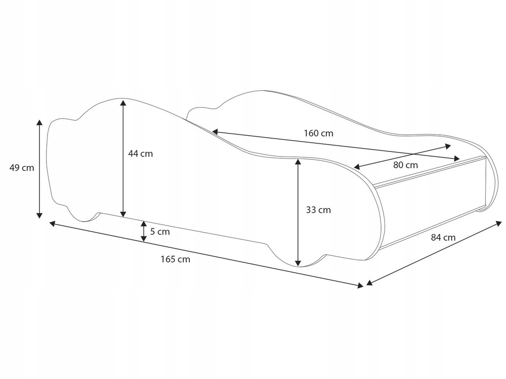 - Wymiary łóżka: 165 cm x 84 cm x 44 cm