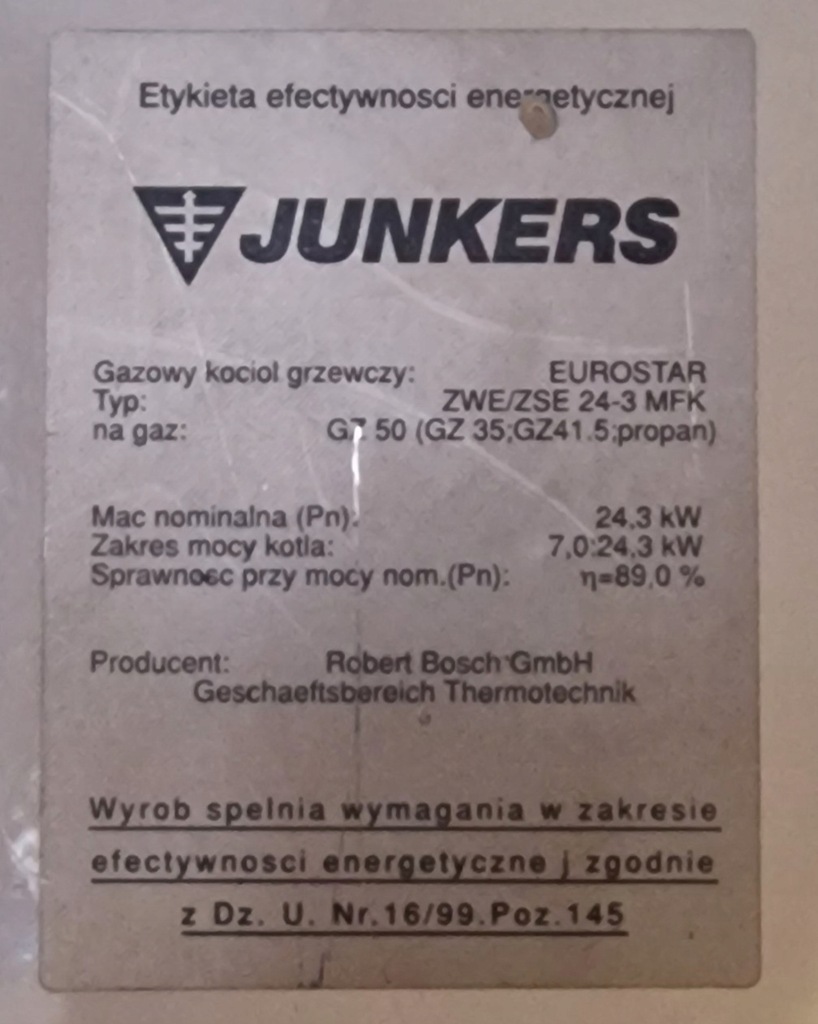 Sprzedam sprawny kocioł gazowy, dwufunkcyjny JUNKERS Eurostar 24,3kW, zasobnik wody użytkowej 100 l, zbiornik wyrównawczy. Urządzenia pochodzą z demontażu zmodernizowanej kotłowni.