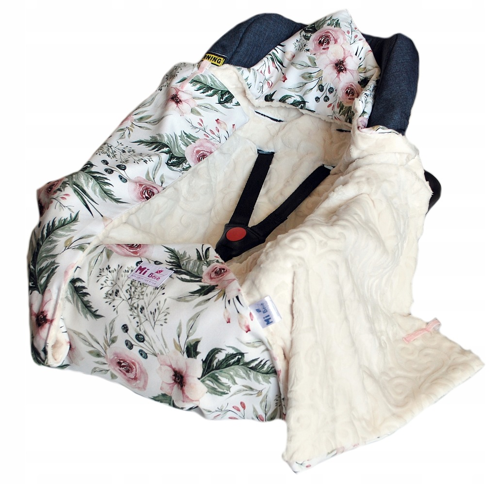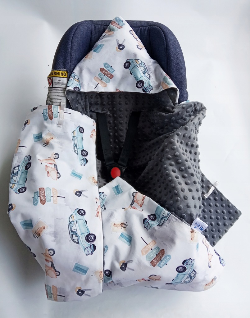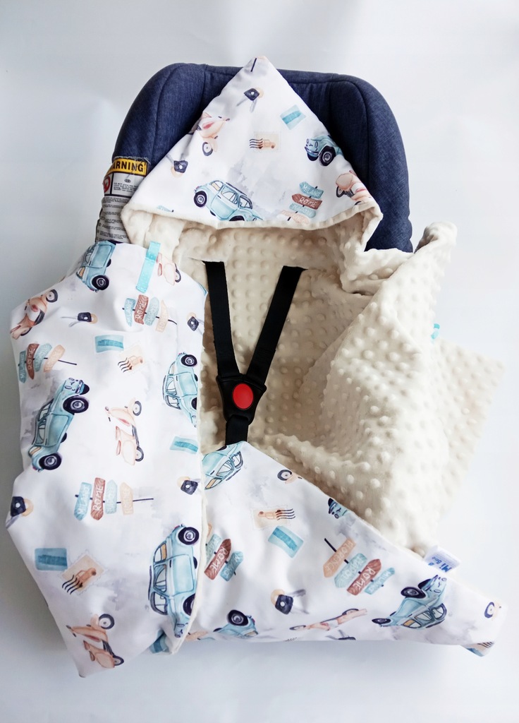 Kocyk dobrze otula dziecko po samą szyję i pozostaje na swoim miejscu dzięki wycięciom na szelki, dodatkowo posiada kapturek na główkę niemowlaka zapewniający komfort i ciepło. Łatwy w użyciu, bez problemu zakryjemy, odkryjemy i wyjmiemy dziecko nie przeszkadzając mu w śnie. Kocyk w kształcie rombu.