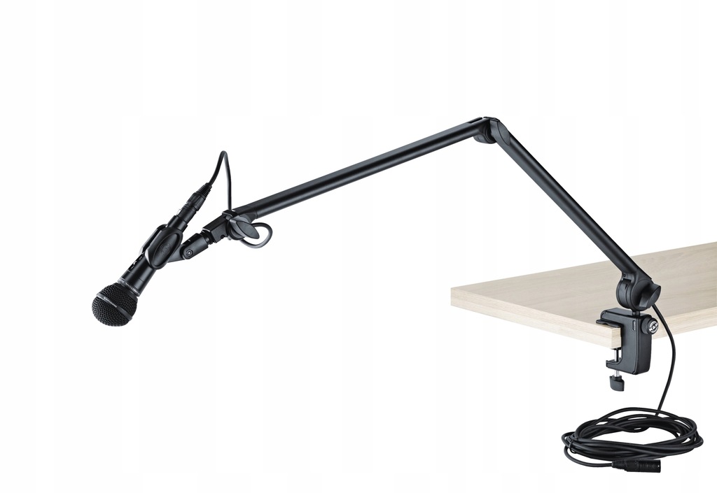 Typ To ekskluzywne ramię mikrofonowe ze złączem gwintowanym 3/8" lub 5/8" w nowoczesnym wzornictwie z nowym innowacyjnym zaciskiem stołowym do szybkiego i łatwego pozycjonowania mikrofonu w studiu lub na stanowisku multimedialnym. 6-metrowy, wewnętrznie prowadzony kabel mikrofonowy ma 3-pinowe złącze wtykowe XLR.